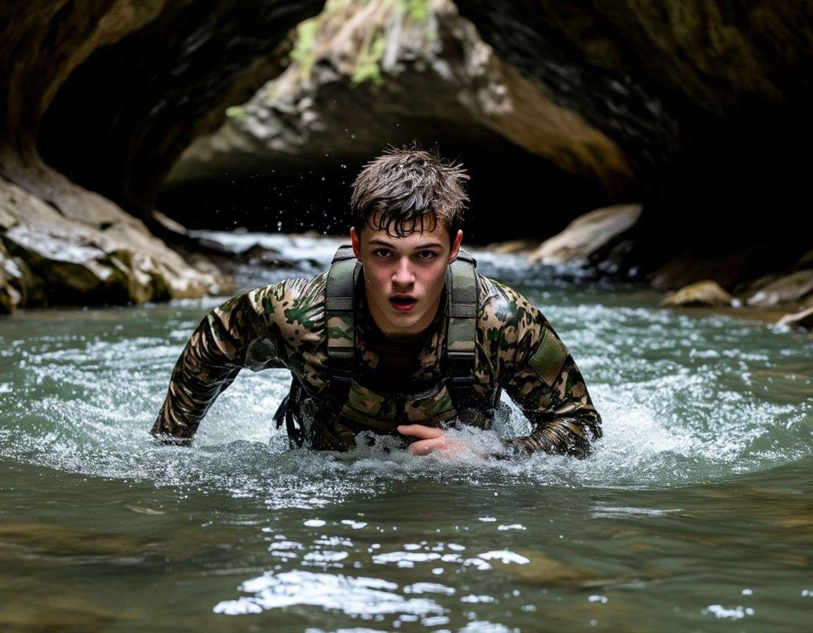 Вот Антон попал в подземный поток и на последнем усилии старается из него выбраться.
