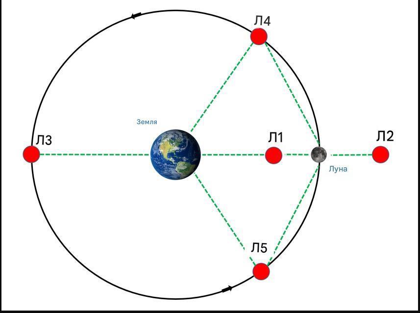 В системе Земля-Луна существует пять точек Лагранжа (L-точек), где гравитационные силы двух объектов уравновешиваются центробежной силой, позволяя третьему телу с пренебрежимо малой массой оставаться относительно неподвижным. Коллинеарные точки (L1, L2, L3) лежат на прямой, соединяющей Землю и Луну, а точки L4 и L5 располагаются в вершинах равносторонних треугольников, образованных центрами Земли и Луны, и являются наиболее стабильными.