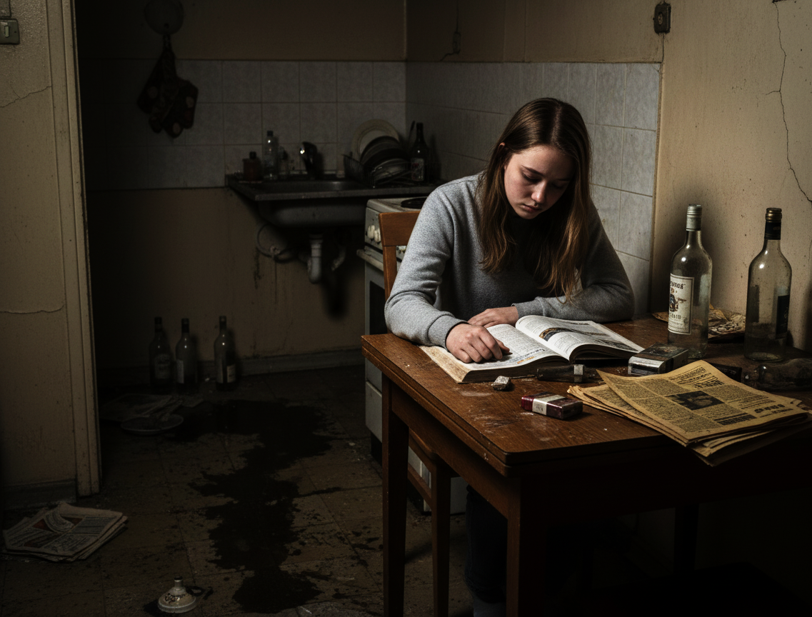 Вечер опустился на город. В квартире Вики пахло сыростью, дешёвым табаком и вечным подвальным, затхлым духом безнадёги. Она сидела за кухонным столом, уткнувшись в учебник по алгебре. Цифры плясали перед глазами, никак не складываясь в формулы. Голод, знакомый и навязчивый, сводил желудок, но сил идти в магазин после школы уже не было. Да и денег на еду тоже не было. Вика сосредоточилась на задаче, пытаясь отгородиться мысленной стеной от пьяного бормотания матери, доносившегося из соседней комнаты. Люда сегодня была в ударе. Она пела хриплым голосом что-то бессвязное под звук включённого на полную громкость старого телевизора.