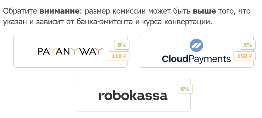 Т.е. Robokassa для иностранных карт теперь на втором экране, находится за кнопкой «Карты другой страны». И, к сожалению, там теперь комиссия в 8%. Это вынужденная мера, т. к. система увеличила комиссию по иностранным картам до 9,99% несколько месяцев назад. Некоторое время мы покрывали её за свой счет, но постоянно, увы, не можем.