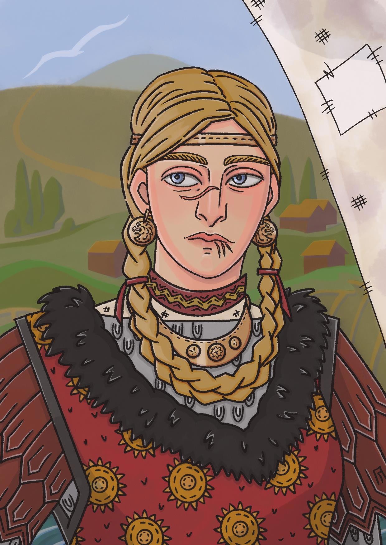 Когда я завершила с формированием визуального облика Марьи, я принялась за её портрет. Каждая деталь этого цифрового портрета продумана. На девушке рубашка с вышитой горловиной, кольчуга и верхняя одежда, с рукавами из кожи, а поверх всего - жилет из красной ткани с меховым воротником и вышивкой. Солнце - один из символов княжества, где живёт Марья. Так же на девушке украшения, выполненные из латуни. На лице важные особенности - свежие, ещё розовые, шрамы. Фон - деревенька близ Струги, порта, откуда Марья на ладье отправляется на противоположный берег.