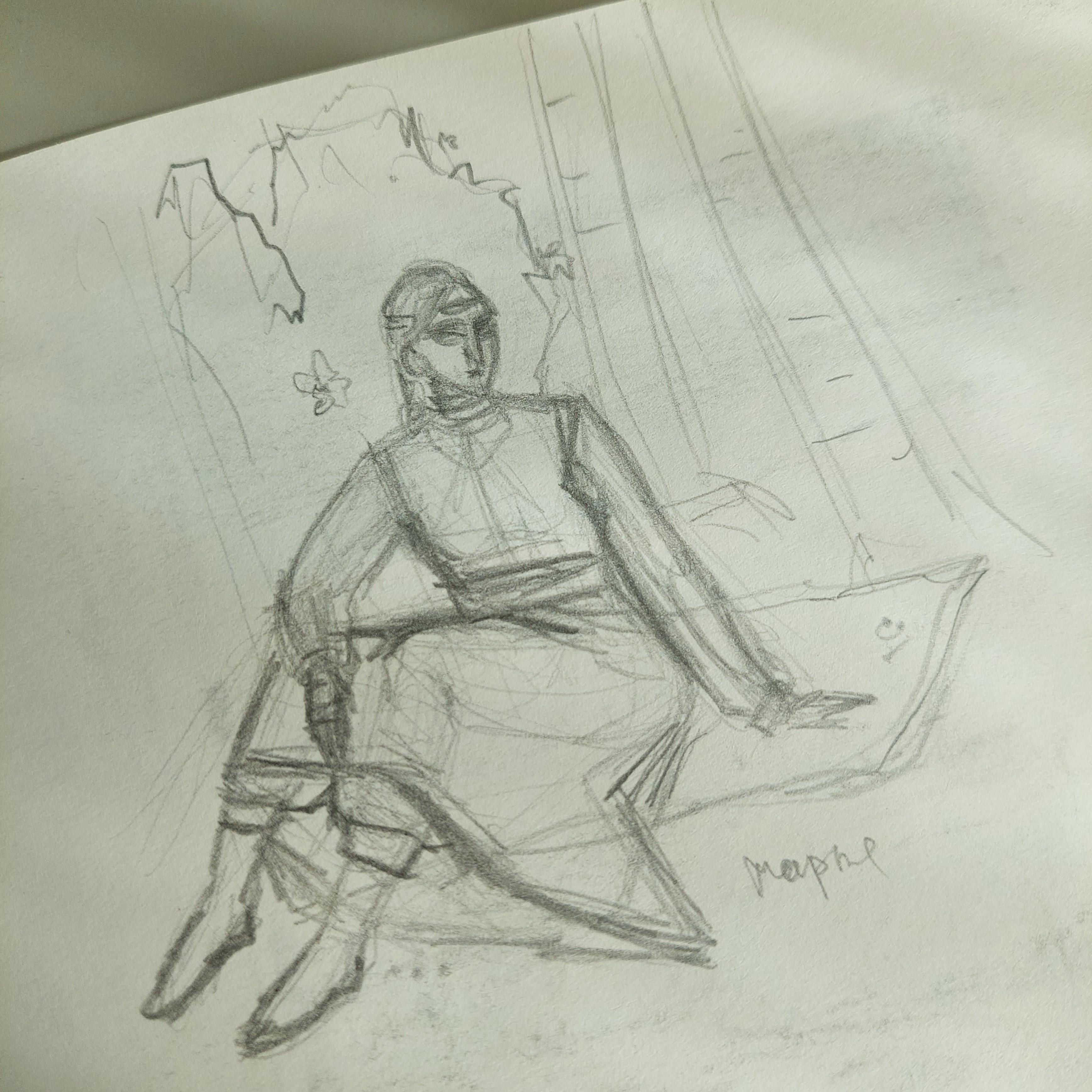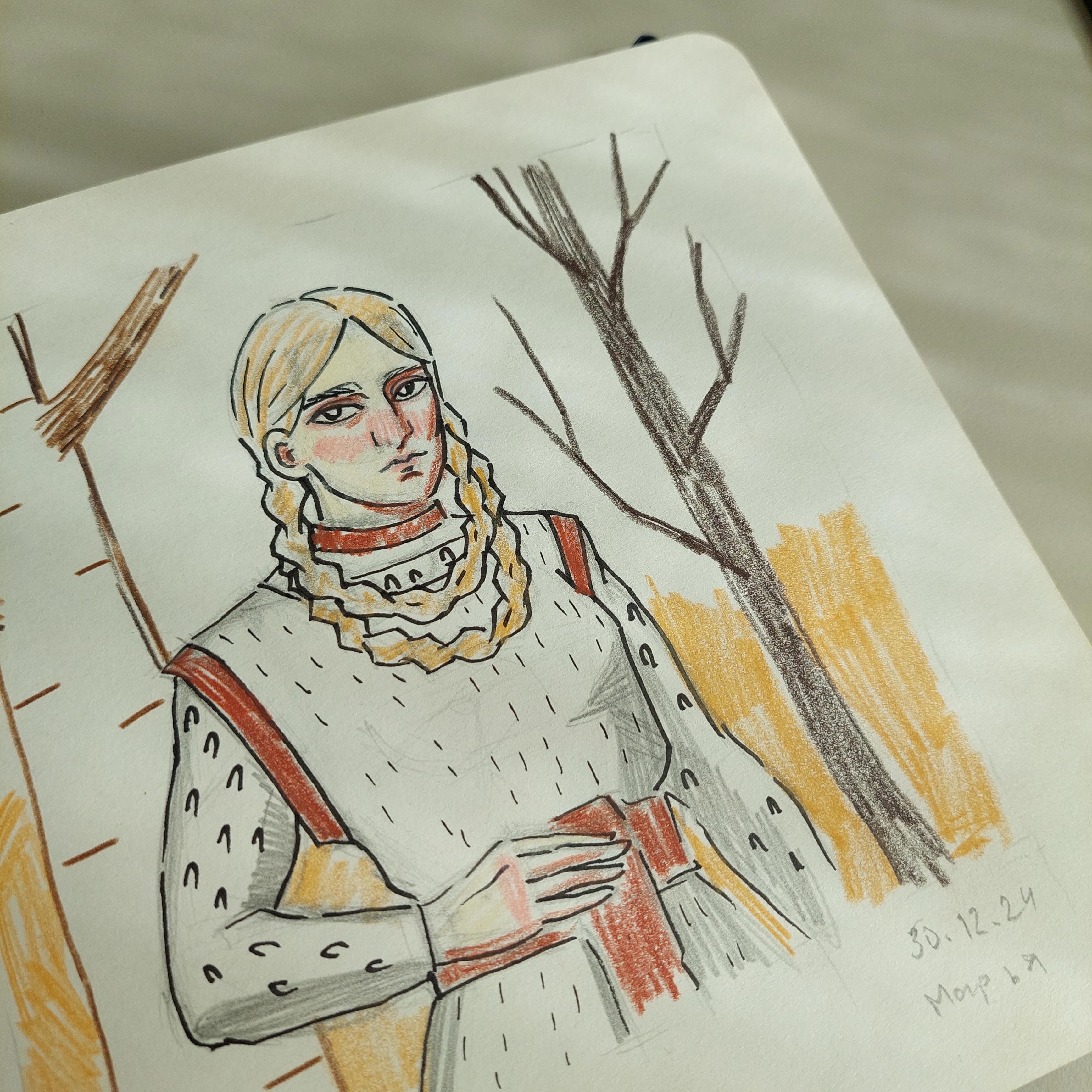 Дальше я делала очень быстрый набросок на тему отдыха Марьи после походов. Когда-то она должна отдыхать, носить обычную одежду, а не тяжелую кольчугу.