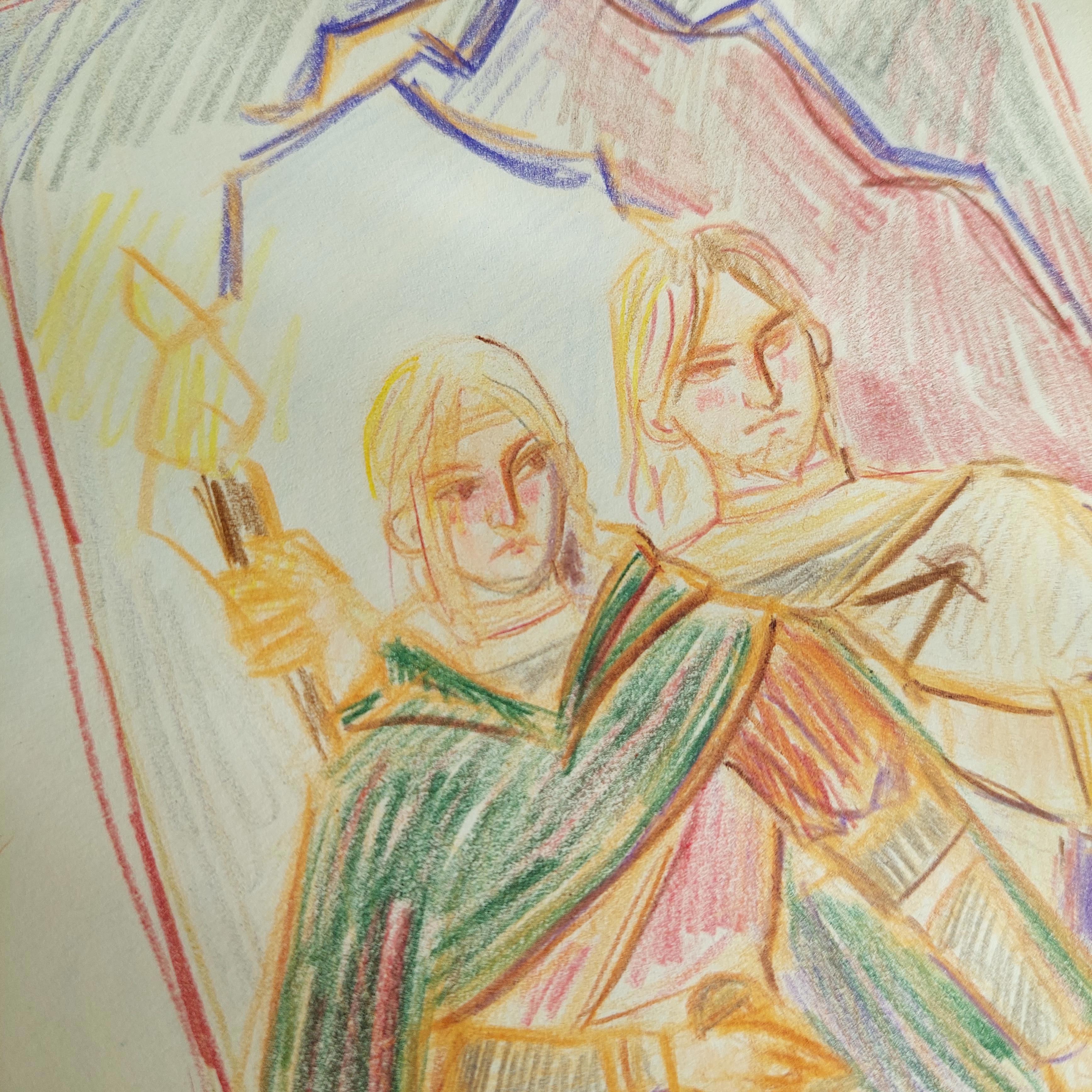 По сюжету Марья вместе с другим основным персонажем отправляется однажды в далёко расположенную пещеру. Я набросала, как бы выглядела эта сцена, чтобы ярче её представить. Возможно, этот эскиз цветными карандашами станет полноценной иллюстрацией, но нескоро.
