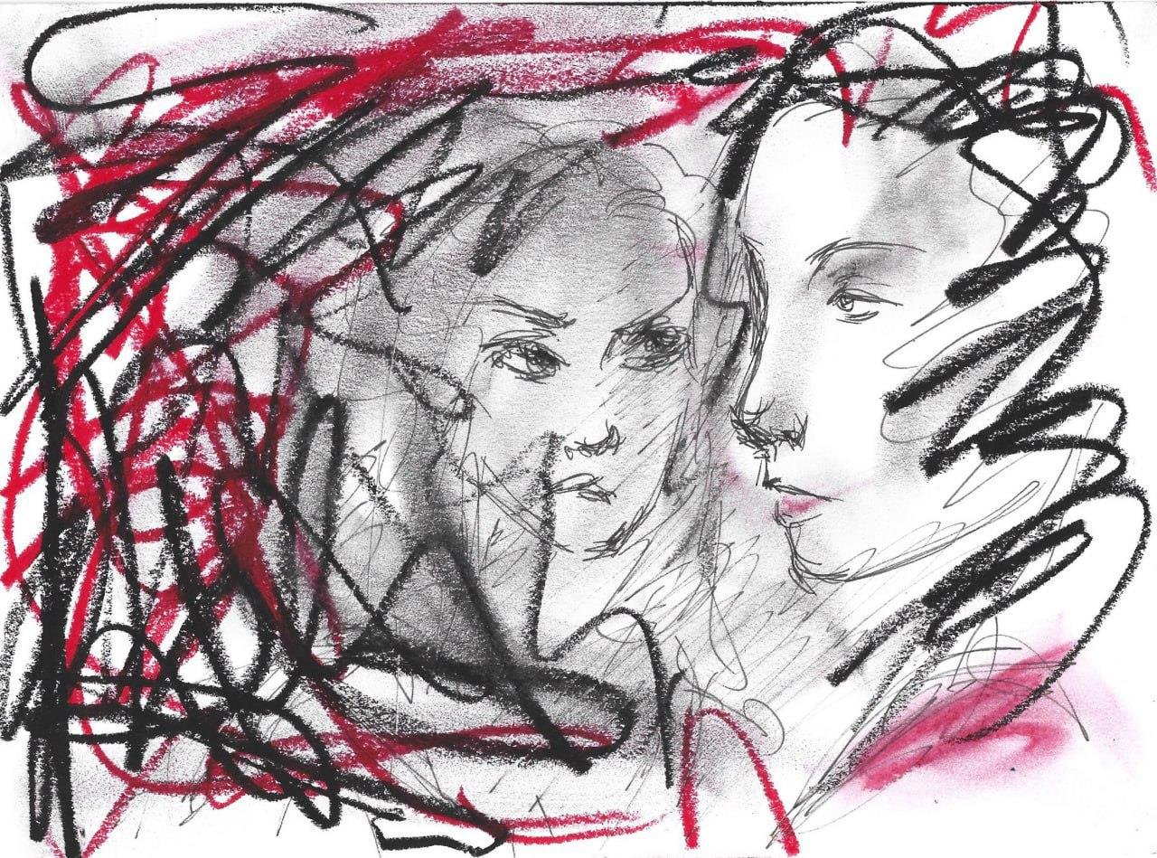 На данном наброске изображены две героини. Одна находится, как бы в тени. Ее глаза полны злобы, она хочет быть на месте другой героини, той, которая сияет и знает о том, как другие ее обожают. Той героини, которая уверена в себе и это видно в каждой ее черте. Вторая героиня не обращает внимание на других и их чувства, она думает только о себе и своем пути.