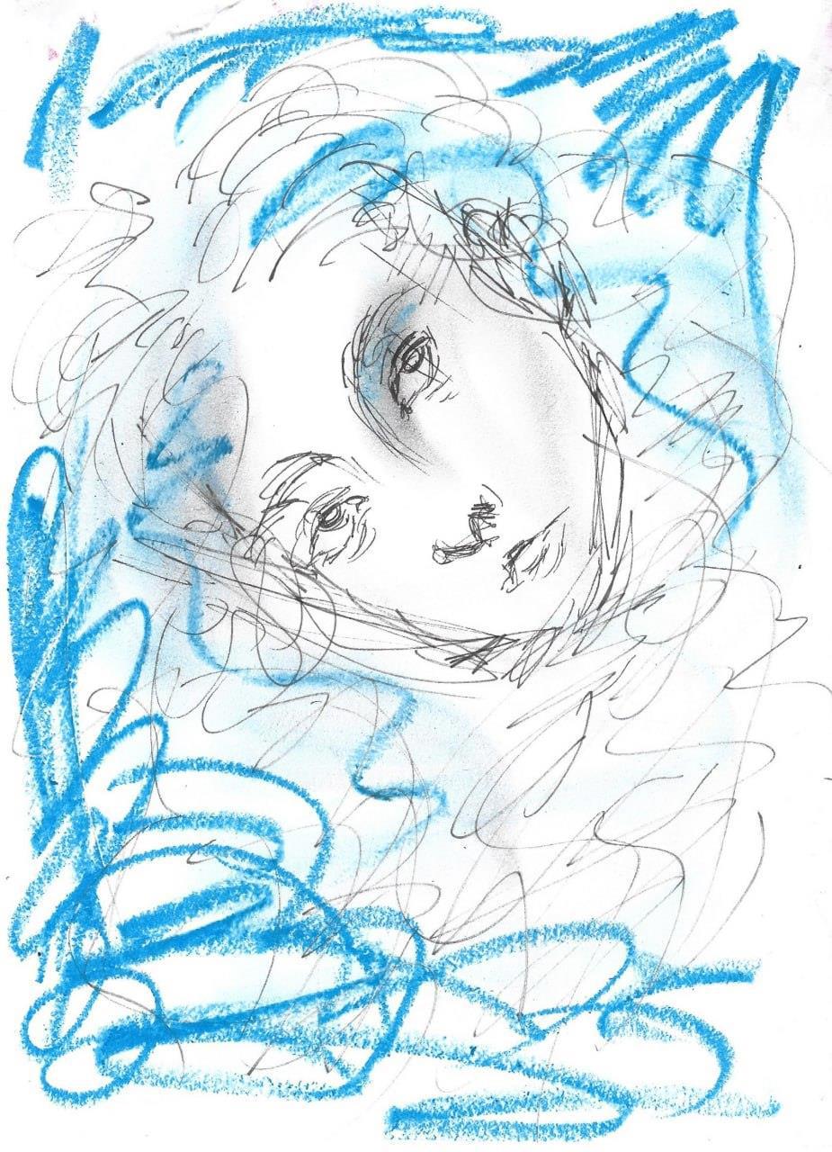 Героиня этого скетча разумом находится где-то в другом мире. Ее взгляд задумчив и направлен в даль. Слегка приоткрытые губы делаю выражение лица ещё более одухотворённым. Голубые линии, словно облака поглощают девушку, отправляя ее куда-то в мир снов и мечтаний.
