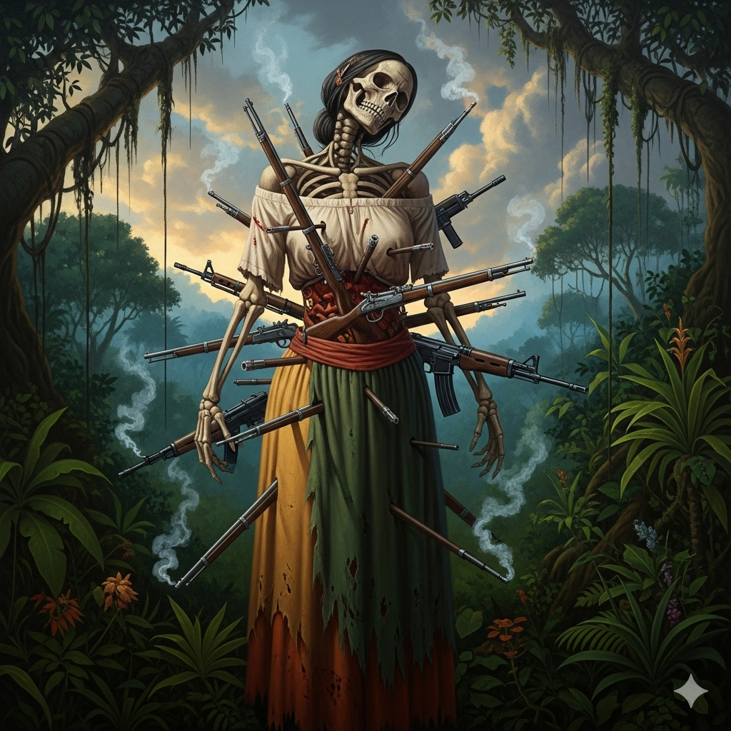 Иконография: Ее изображают в виде женщины-скелета (похожей на Санта Муэрте), одетой в крестьянскую одежду, тело которой пронзено не стрелами, а дымящимися стволами старинных мушкетов и современных винтовок.