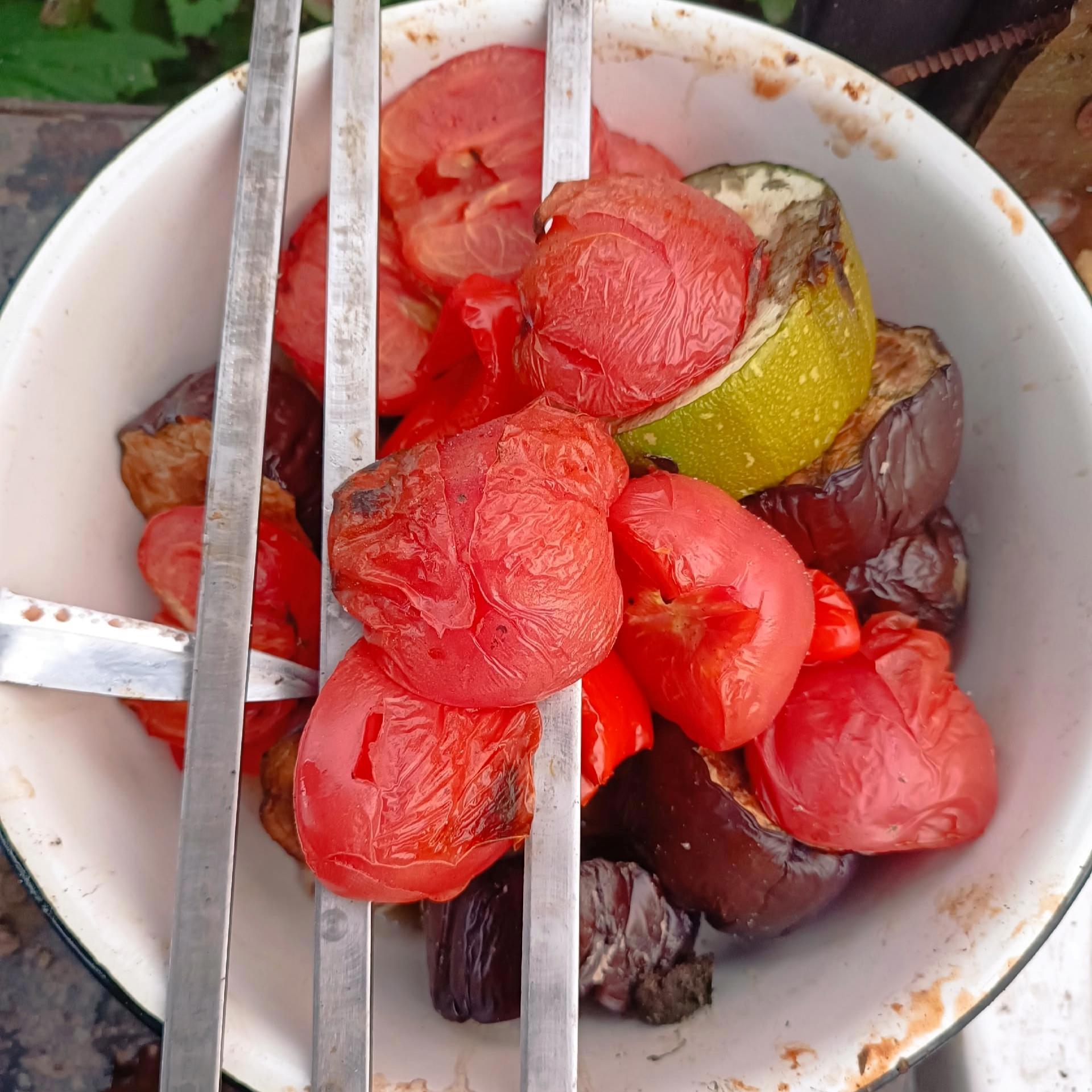 Кабачки, баклажаны, лук, помидоры и перцы болгарские топим над углями, пока они доходят до шашлычной температуры. Потом печёные над углями овощи закидываем в блендер и через минуту блюдо готово. Добавить перца и соли по вкусу. Пойдёт, как намазка на хлеб или лаваш, и как дополнение к шашлыку.