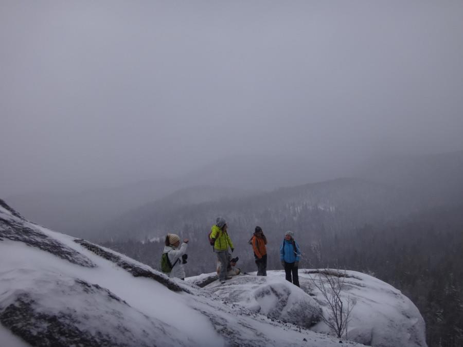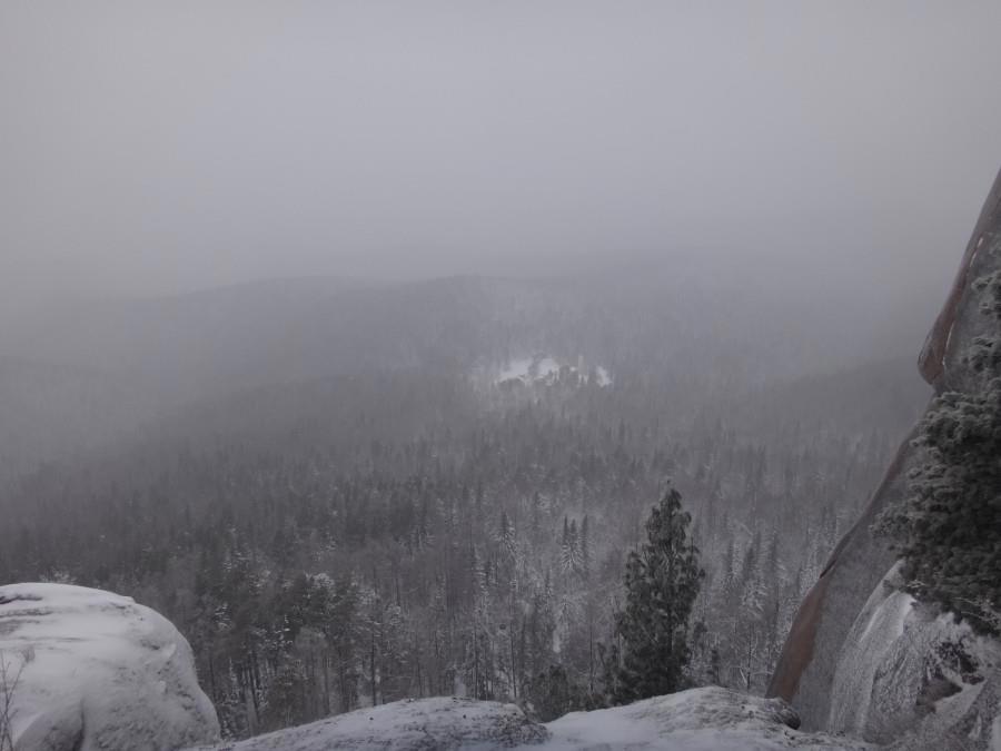 «Второй» — это здоровенная скала, высокая, с огромной полкой, откуда видно долину ручьев Нарыма и Беркутовского. Подъём очень лёгкий, сплошь по зелёнке, лишь на самую полку ведет простой скальный ход. Даже той скользкой зимой он был вполне проходимый. Девчонкам понравилось — всё-таки в этом месте перепад высот более ста метров, вершины сосен далеко внизу… Вон то светлое пятно среди крон — это кордон Нарым. Я показываю девчонкам — вон там буду ночевать. Ну, круто же: