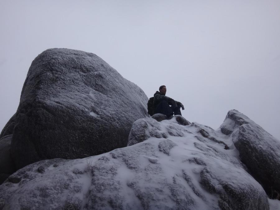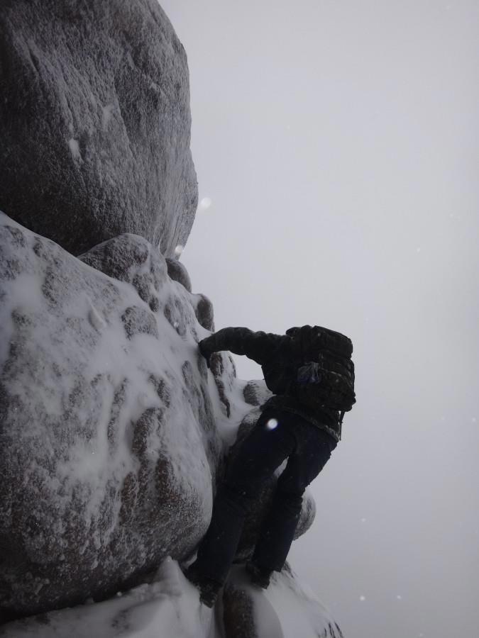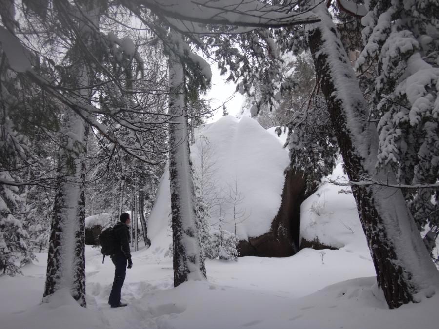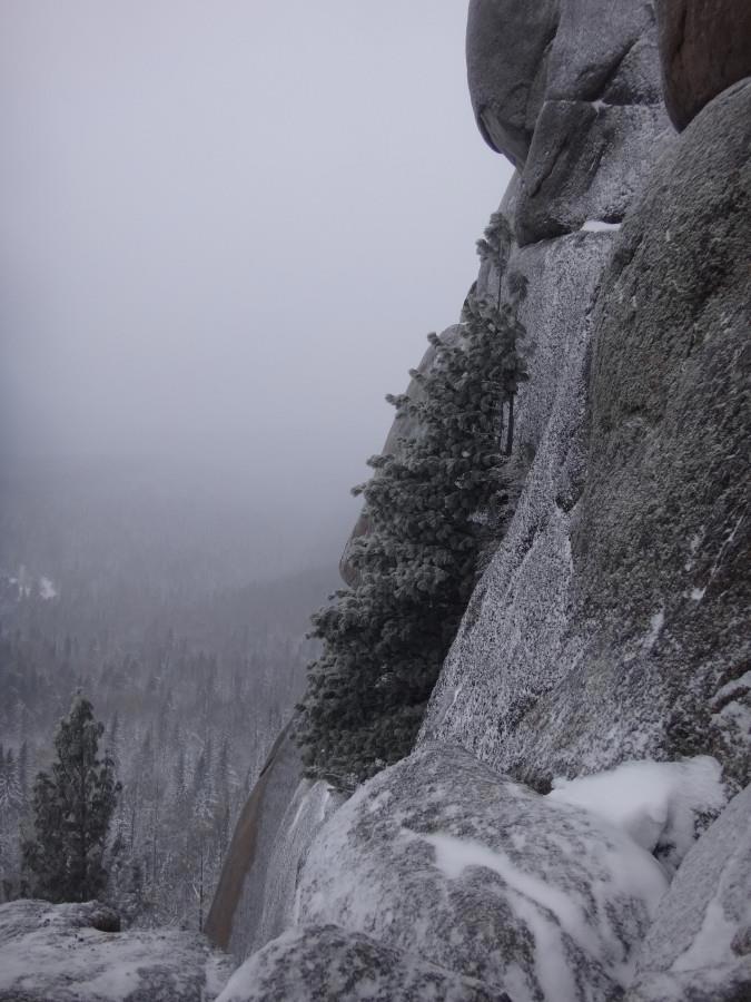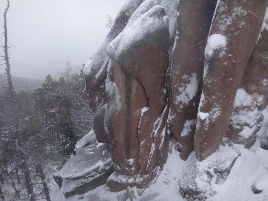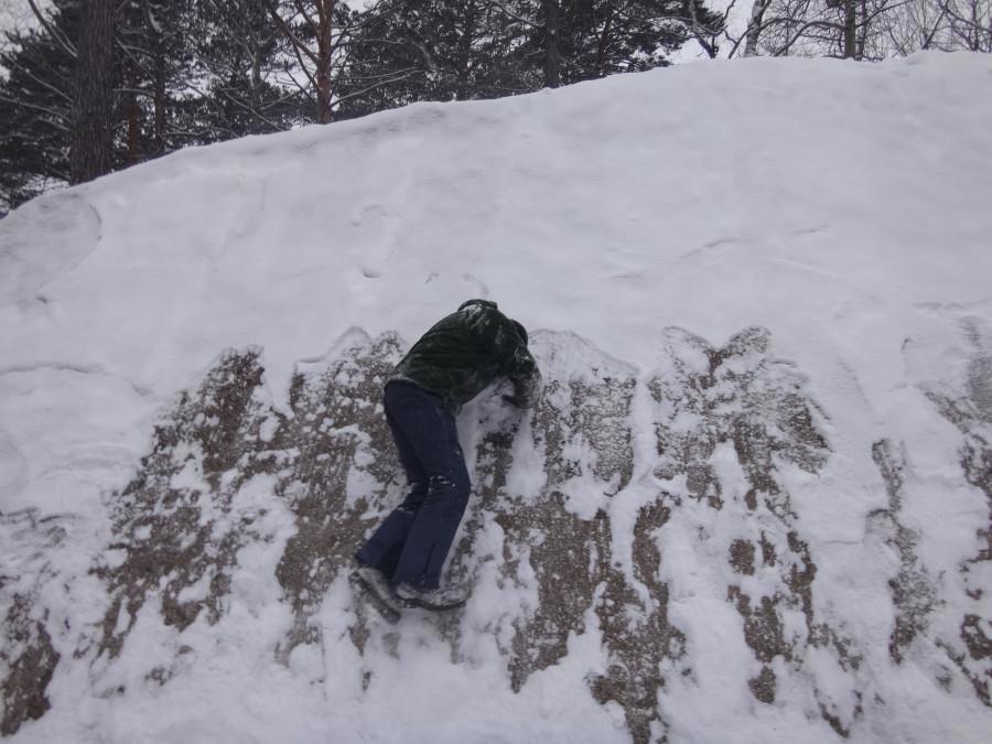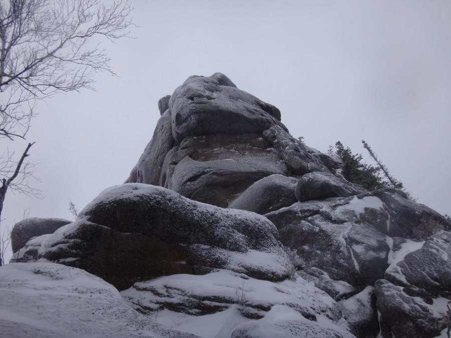 Простого, т. н. «пешего» хода на этот камень нет. Скальный подъём, хоть и несложный, но… блин… как же ссыкотно было лезть на скалу зимой, когда ноги скользят, а знакомые зацепки все нахрен пообледенели. Закидываясь туда, я думал только, как бы мне ухитриться празднично не уе…пасть. Мне же говорили, что 40 лет не празднуют… Или это про 40 дней говорилось? Страшно, короче…