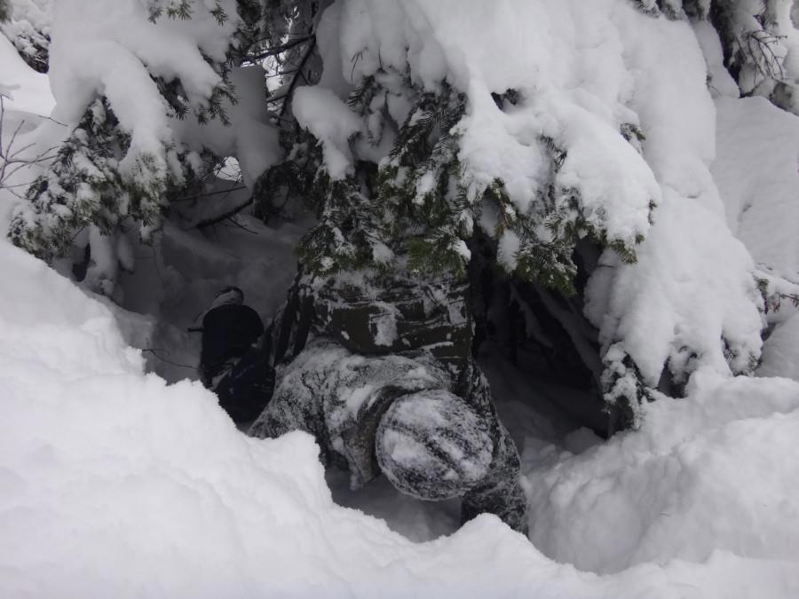 Когда я работал на Северах, местные охотники мне показали такую вот комнату отдыха. Залезешь туда — там тихо (а значит и тепло), ни пурги зимой, ни дождя летом. Можно даже костер разводить — дым уходит сквозь хвою насквозь, а ветер снаружи не проникает. Природа изобрела мембрану куда раньше, чем фирма Event. И ещё — елок много вокруг — выбирай любую, какая больше нравится… Куртку из неплохого виндблока (подарили) уже понемногу продувало, а в этом лесном шалаше мне было хоть бы хны: