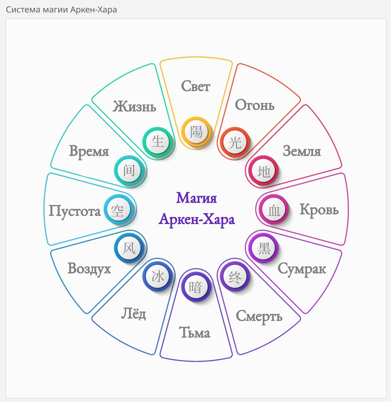Как видите, здесь Свет напротив Тьмы, Жизнь напротив Смерти и так далее — это и выглядит логично и красиво, и имеет значение в том, что, к примеру, против некроматических порождений вроде скелетов лучше работает магия Света и Жизни (ну в общем, тут всё по классике). Часть магии привязана к богам, но по легендам из хаотической магии в систему все подвиды облёк великий император и маг Амберион, сделав систему как раз вот такой. Он же придумал облечь заклинания в магические формулы, по факту, сделал эдакий алфавит для магов, чтобы ликбез было проще устраивать :)