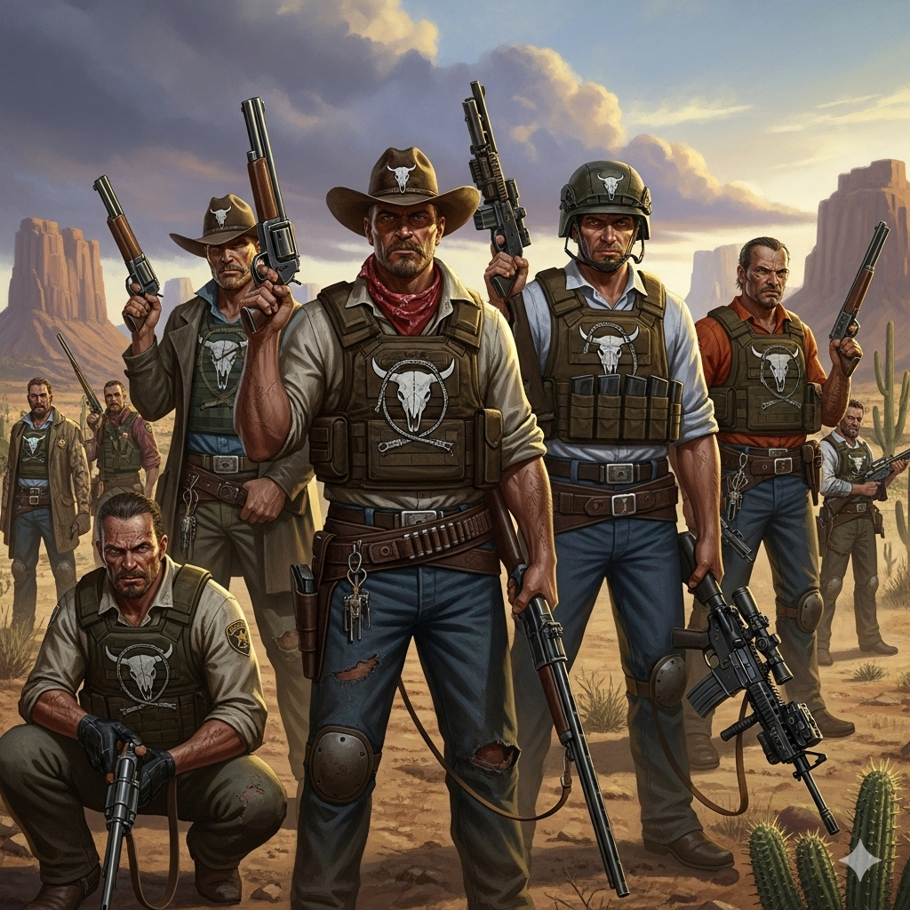 Разнообразное и внушительное: Мощные револьверы крупного калибра, помповые дробовики, крупнокалиберные винтовки с рычажным затвором (для пробивания укрытий) соседствуют с автоматическими винтовками типа AR-15 или FN FAL. Часто используют лассо из стального троса для поимки беглецов.