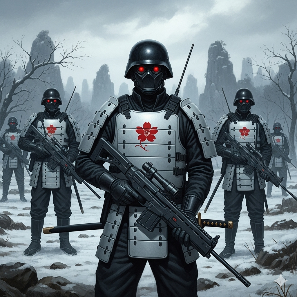 Сохраняют некоторые элементы своей старой униформы: характерные конические шляпы с красной кистью для офицеров, мундиры темных цветов с широкими плечами. Но под ними — современная японская броня и снаряжение. Это создает образ чего-то устаревшего, но все еще опасного.