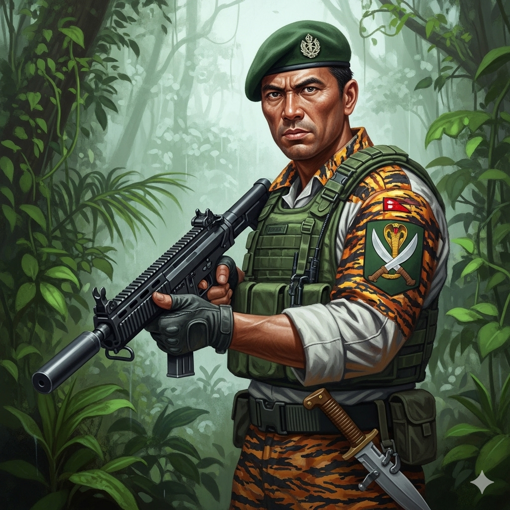 Нарукавная нашивка: Два скрещенных ножа-кукри из серебра на темно-зеленом фоне. Над ними — личная эмблема династии Клайв-Рана: золотая, готовая к атаке королевская кобра.