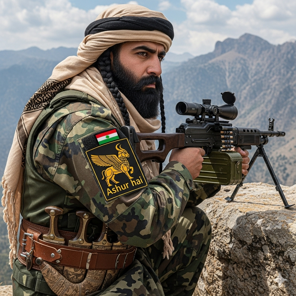Нарукавная нашивка: Стилизованный крылатый бык шеду — древний ассирийский дух-хранитель. Под ним — девиз на арамейском языке: «Ашур хай» («Ассирия жива»).