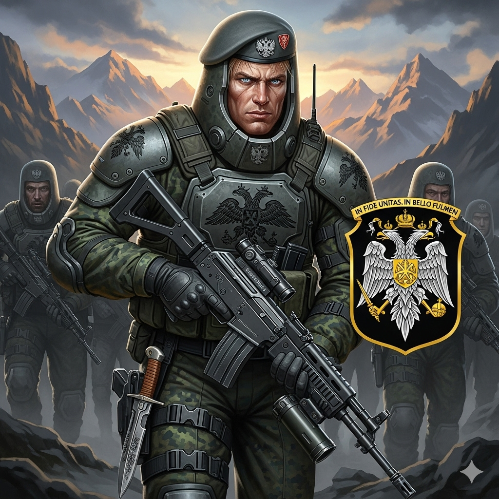 Полевая форма: Высокотехнологичный камуфляж в темно-зеленых, серых и коричневых тонах («Егерь-3»), идеально подходящий для лесов Европы и гор Ближнего Востока. Встроенные гибкие бронеэлементы, на плечах и груди — тисненый силуэт трехглавого орла. Шлем имеет агрессивную, слегка вытянутую форму, напоминающую средневековый бацинет.