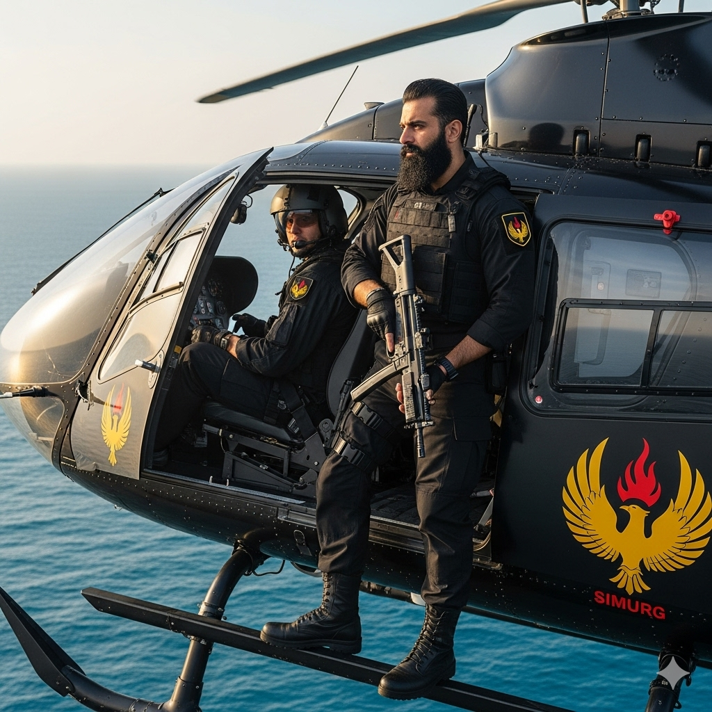 Нашивка: Стилизованное изображение Симурга — мифической птицы-защитника — на фоне пылающего огня. Нашивка выполнена в золотых и красных тонах на черном фоне.