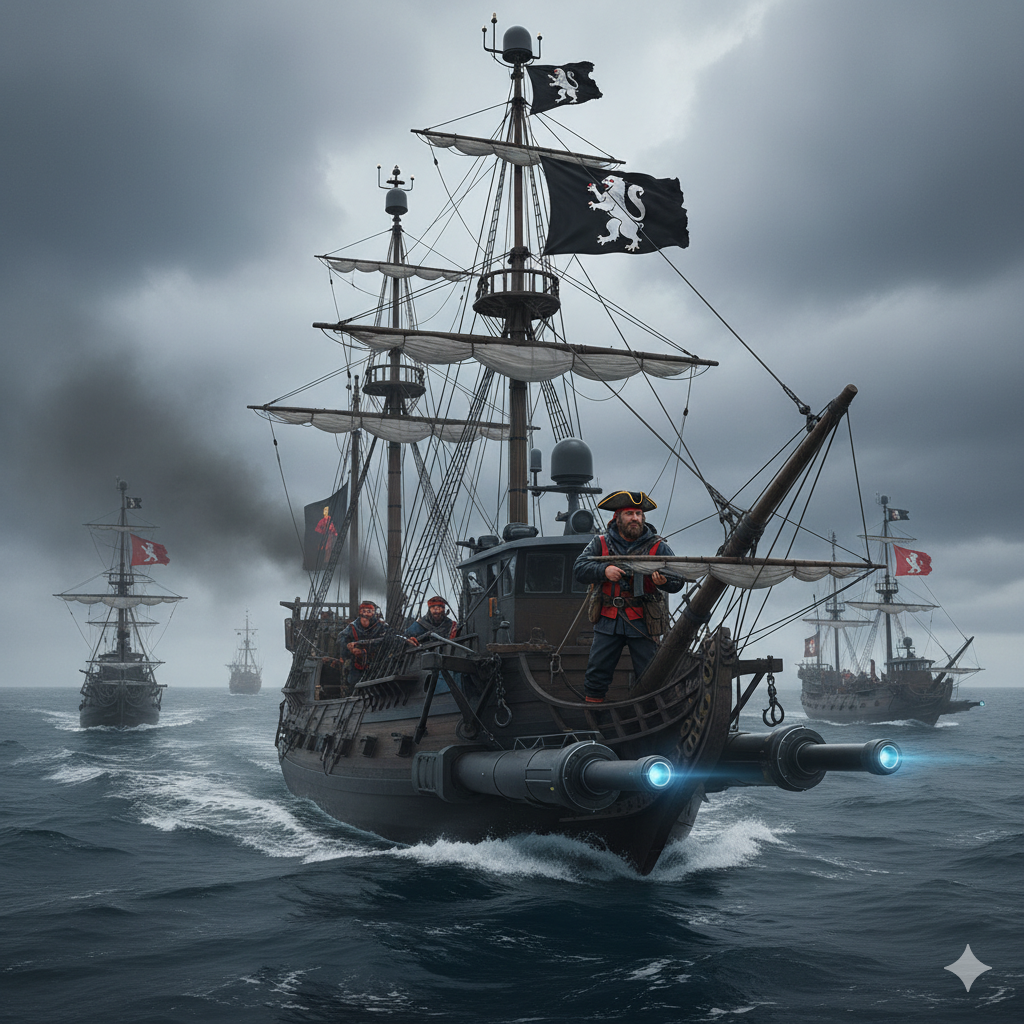 Их корабли — это быстроходные патрульные катера и корветы, оснащенные не только стандартным вооружением, но и скрытыми системами: гарпунными установками для абордажа, мощными акустическими пушками и дымовыми завесами. Команды вооружены короткими автоматическими карабинами, дробовиками и тесаками.