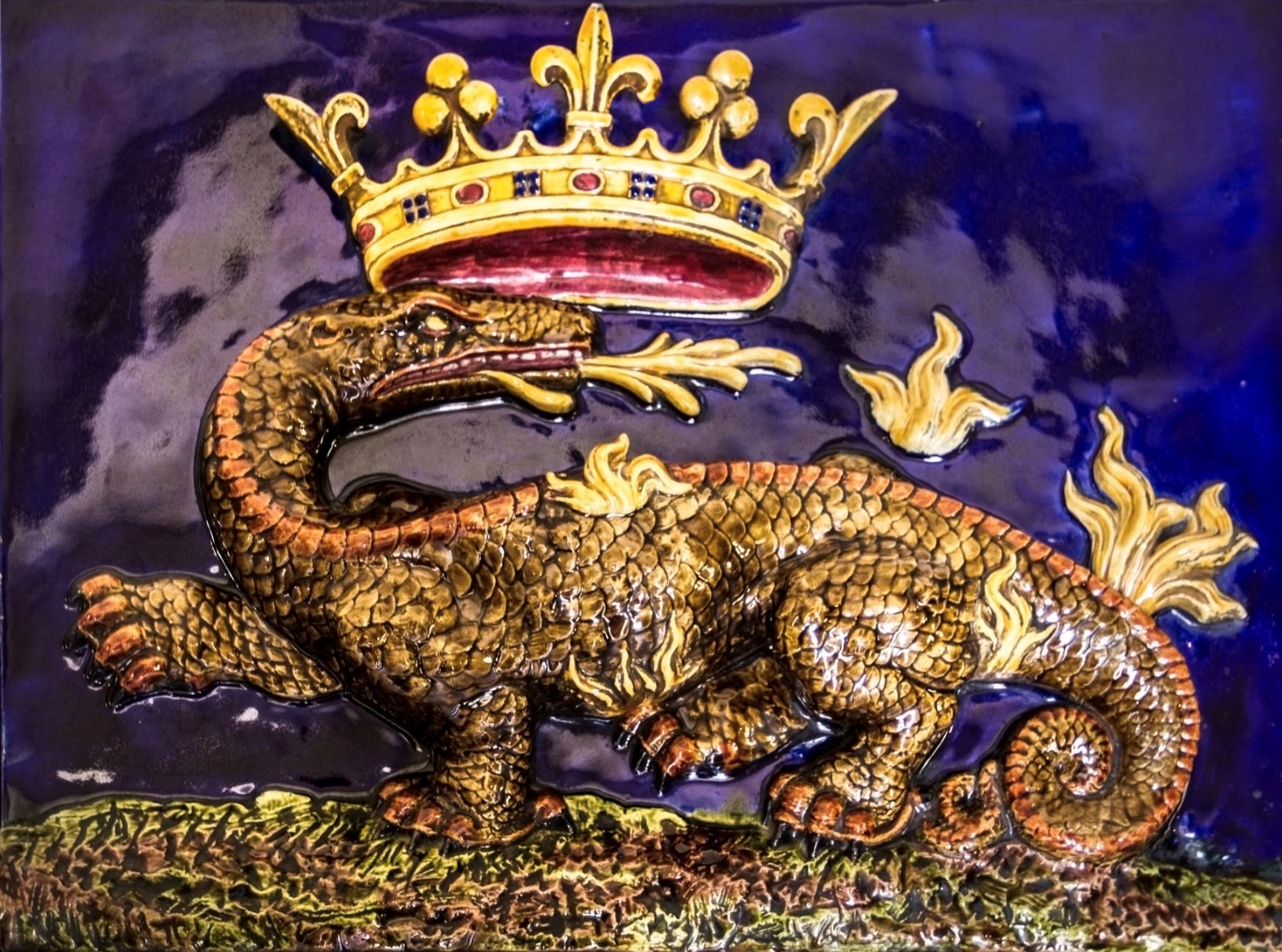 Средневековая иконография использует образ саламандры в качестве символа праведника — хранителя веры среди превратностей бренного мира. Помещая саламандру на свой герб, его владелец, по сути, заявлял, что ему присуща стойкость, и он совершенно не боится опасности.