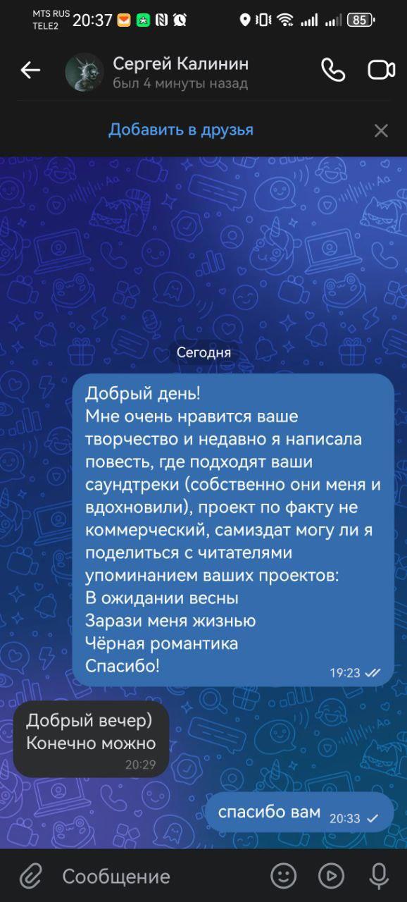 Идея включить творчество Deform в сборник рассказов, где "Реликвия" займет почетное место, родилась сама собой. Конечно, для реализации этой задумки мне необходимо было получить разрешение. Не могла я и представить, что буду писать лично правообладателю!