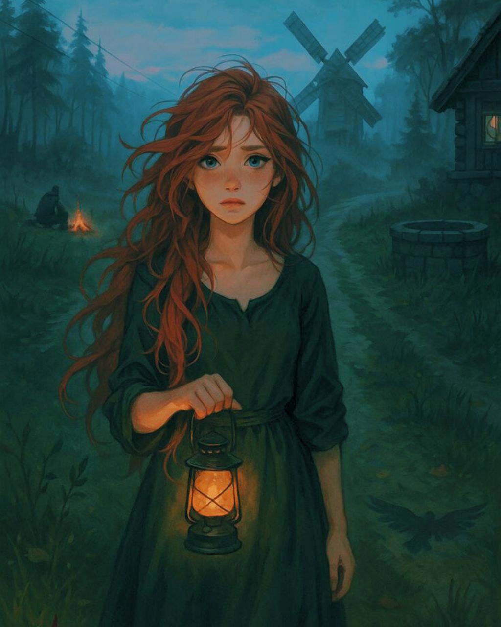 – рыжие волосы, босые ноги, взгляд настороженный или упрямый