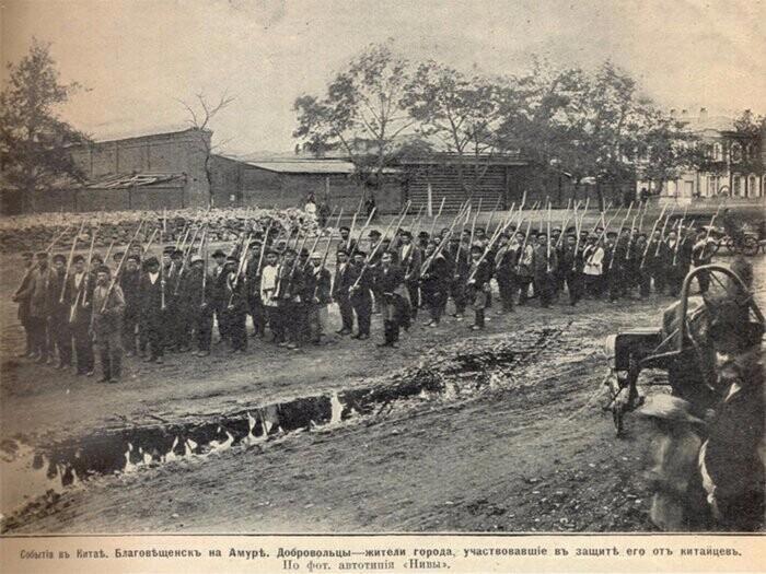 Итак, к 04 (17) июля была закончена линия укреплений. На ней установили все имеющиеся семь орудий. Действия русских артиллеристов были такими удачными, что они сумели перетопить все китайские джонки на том берегу и т.о. снять вопрос переправы китайских войск. Добровольцами записались около тысячи горожан. Но городские ополченцы были вооружены только небольшим количеством старого оружия. Судя по фотографиям, некоторые ополченцы были с вилами, топорами и даже палками. Справедливости ради - оснащение хунхузов было ещё хуже, но их было много, очень много.