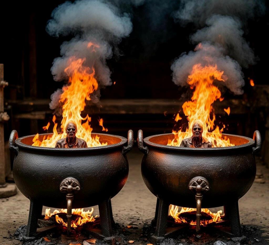 Мужчина оглянулся и увидел что в котле, стоящем рядом, из смолы показалась голова.