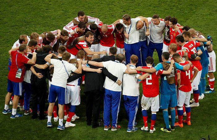 На групповом этапе сборная России разгромила Саудовскую Аравию (5:0), победила Египет (3:1), уступила Уругваю (0:3), но к матчу с южноамериканцами уже досрочно вышла в плей-офф. Наконец, в 1/8 финала вызвала эйфорию у населения, отыгравшись по ходу игры с Испанией и в итоге победив ее в серии пенальти.