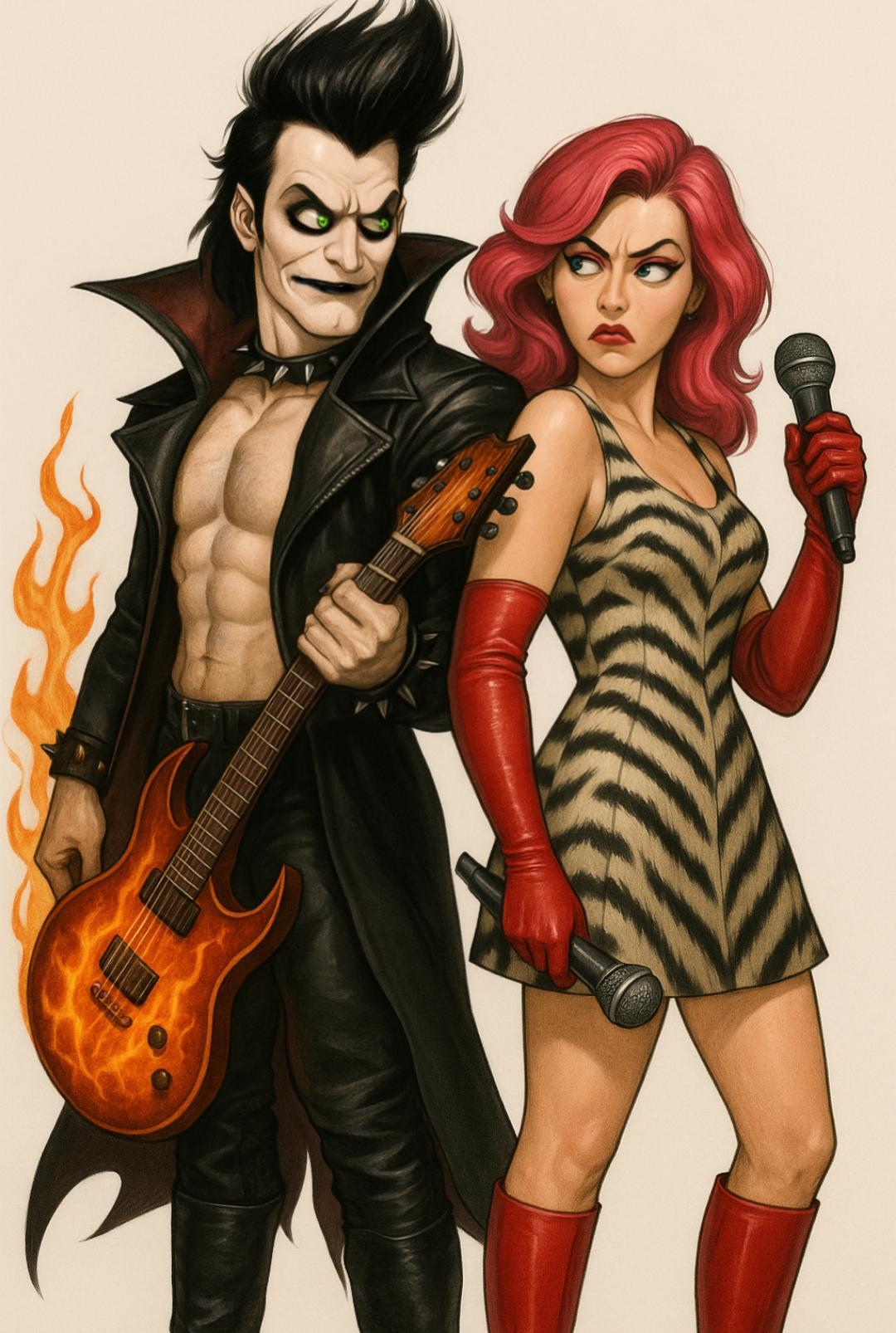 Поэтому новый спойлер косвенно намекает о том, что скоро мы услышим поп-рок. И я вновь попыталась постичь азы промт-инжиниринга для создания картинки ниже, что демонстрирует полубоевой музыкальный срач — вон как Мистер Рок и Мисс Поп недружелюбно друг на друга зыркают. Первого аж перекосило от злости (или он просто опять нанюхался каких-то своих белых порошков). А Мисс Поп вооружилась двумя микрофонами сразу, чтобы усиливать одну атаку внезапной следующей атакой сразу.