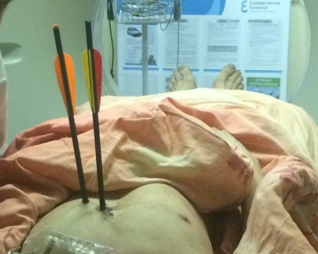 Увидь я такое - удивился бы. Во-первых кучно, а во-вторых древки практически под одним углом - кажется, что жертва не шевелилась, пока в него стреляли. Зная длину таких болтов скажу, что вошли они довольно глубоко. А вошли они реально глубоко - до позвоночника. Один уперся в кость, второй прошел рядом и практически насквозь. Благодаря тому, что наконечник у спортивного болта круглый и его диаметр такой же, как у древка, древки "заткнули" раны и человечек не умер от потери крови. Более того, врачи провели операцию и спасли ему жизнь. К счастью для пациента, болт с оживальным или коническим наконечником быстро передает энергию цели и проникающая способность у него не то чтоб огромная, поэтому позвоночник остался цел.