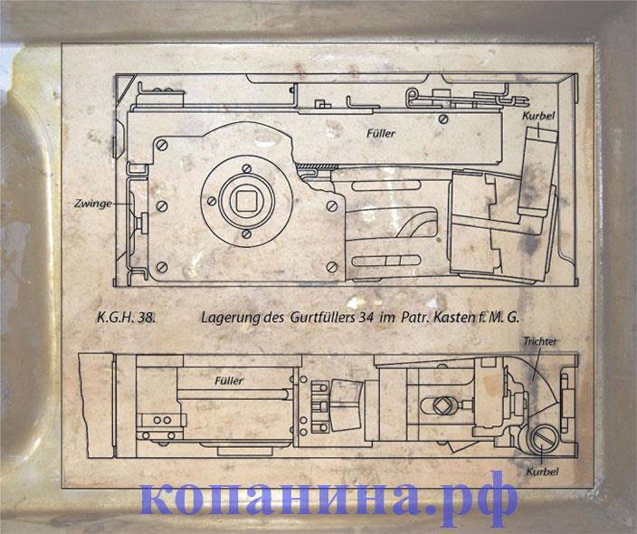 Хранились машинки для снаряжения лент в патронном коробе Gurtkasten. Внутри короба наклеивалась этикетка со схемой укладки машинки в ящик