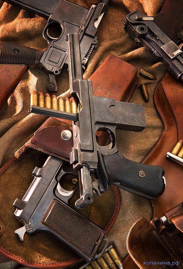 Маузер -96, Люгер и Зимплекс (из такого в затопленном метро стрелял Поппендик), под ним - Штайер (такой же снялс мертвого корреспондента Берестов). Интересны тем, что у трех архаичное заряжание обоймами.
