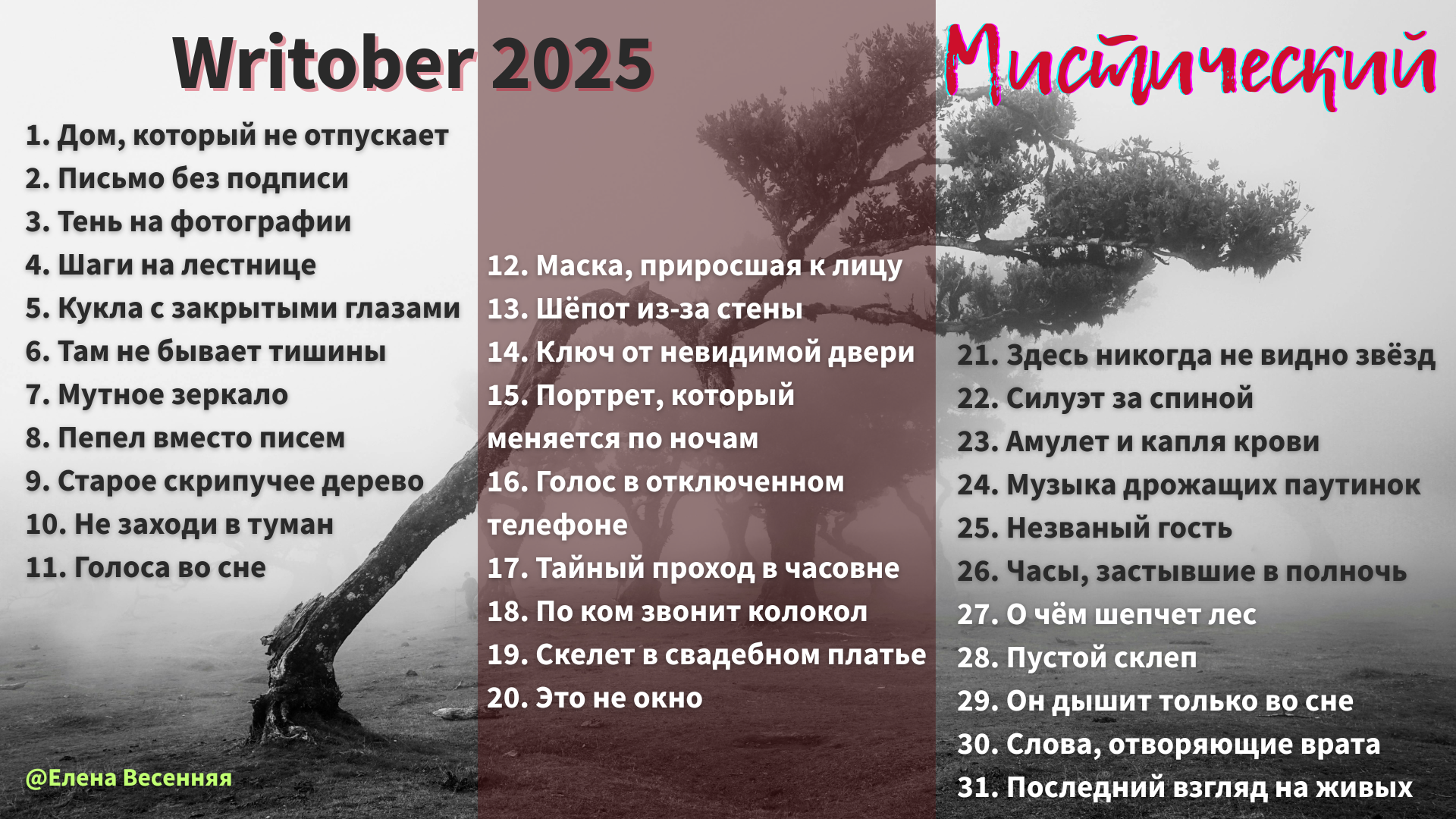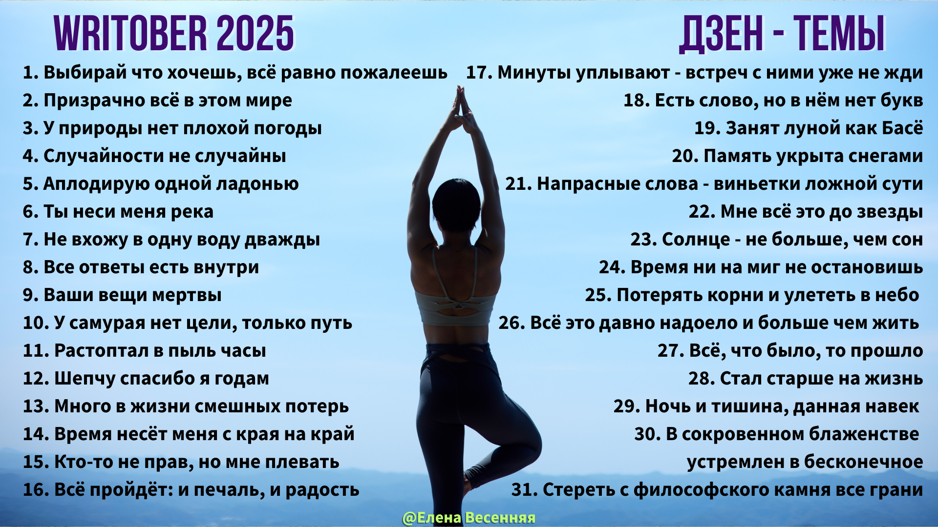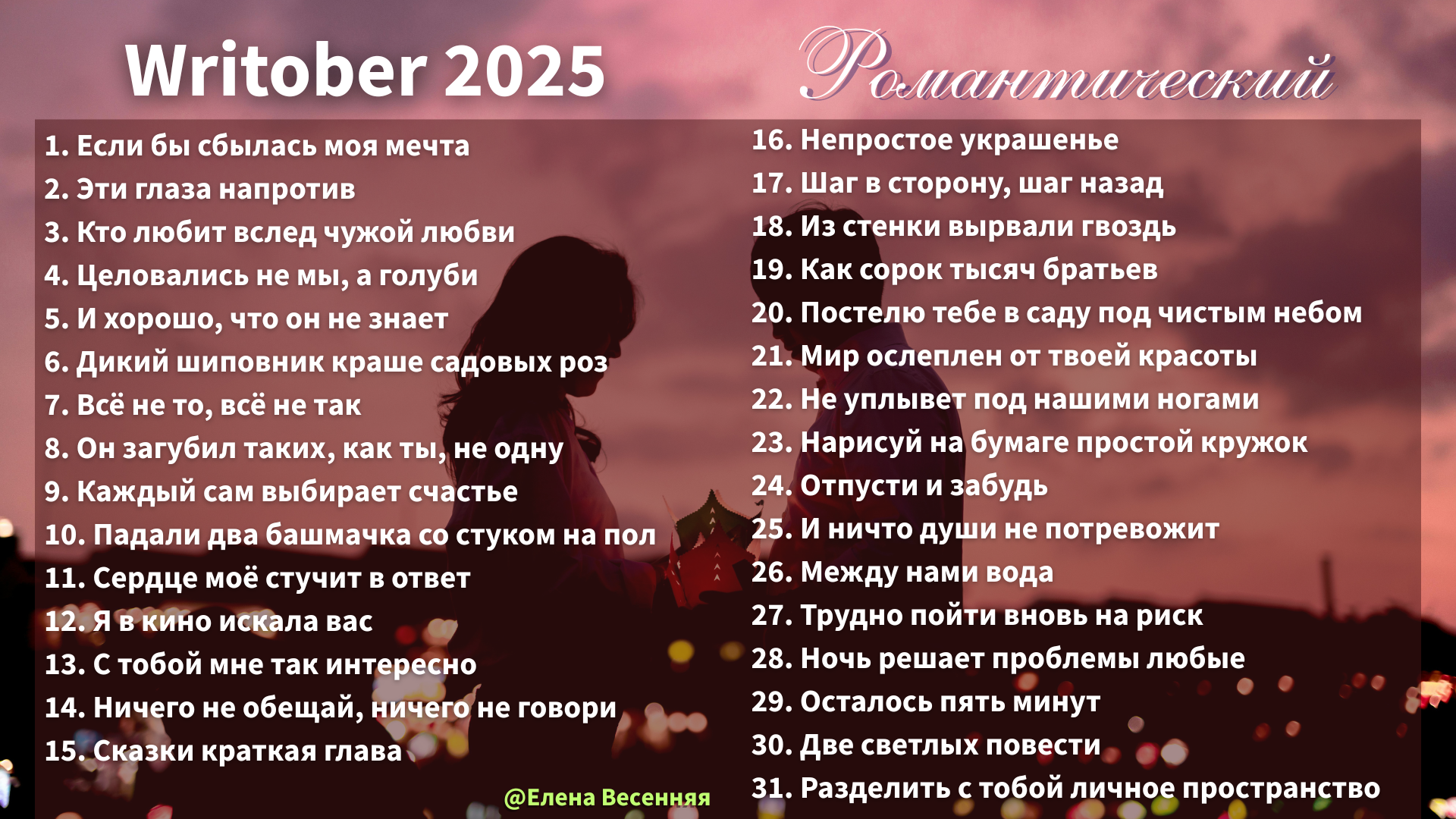 Автор: Елена ВесенняяКогда прода не пишется, шаловливые ручки занимаются чем попало. Например, сегодня наклепали возможные темы для райтобря. Вышло аж четыре тематических. Сама вряд ли что из этого возьму (есть идея в другую сторону), но вдруг кого вдохновят.