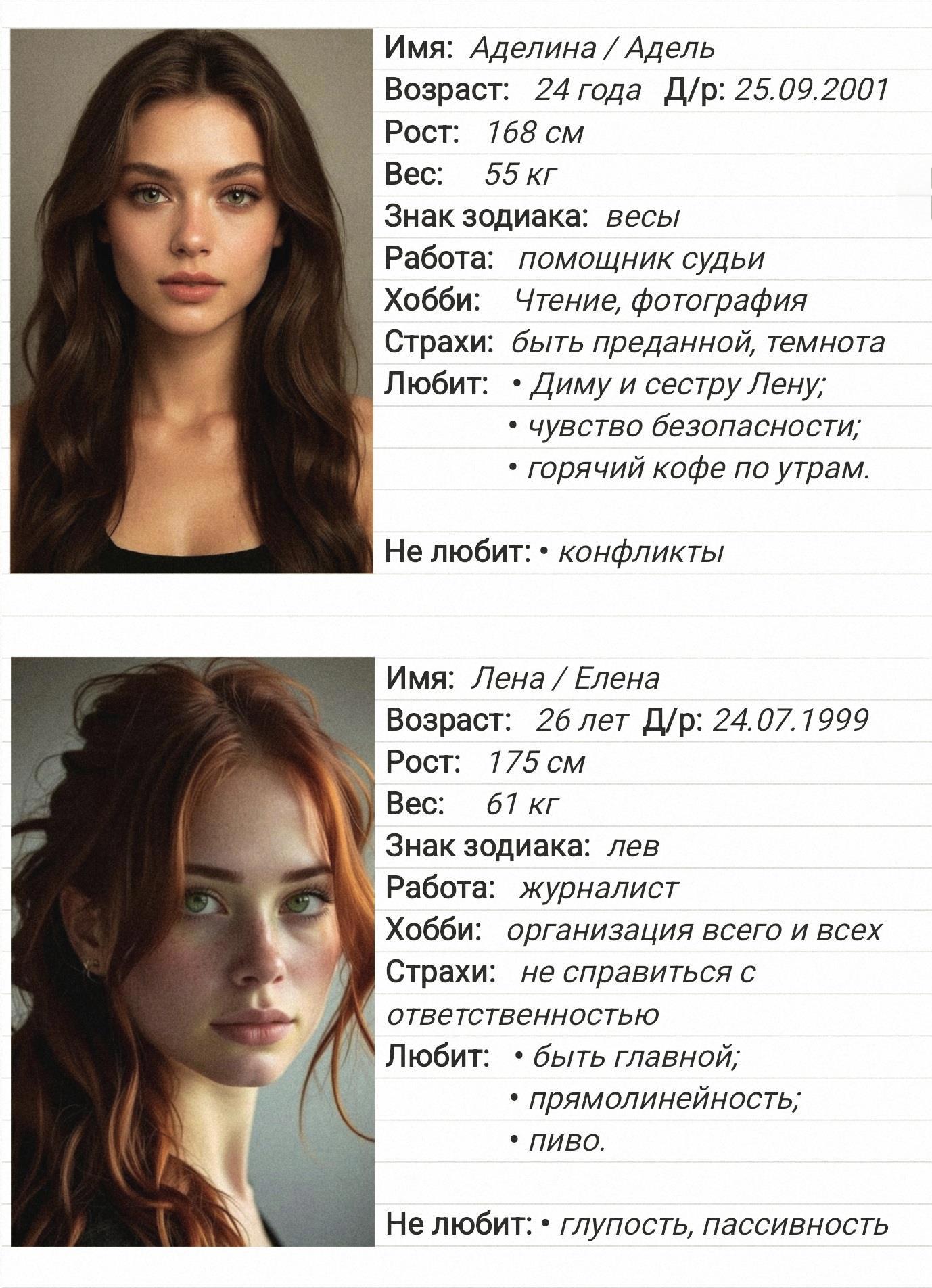К выходу новых глав, знакомлю вас с двумя героинями, чья связь будет проверена на прочность: Аделина и Лена.