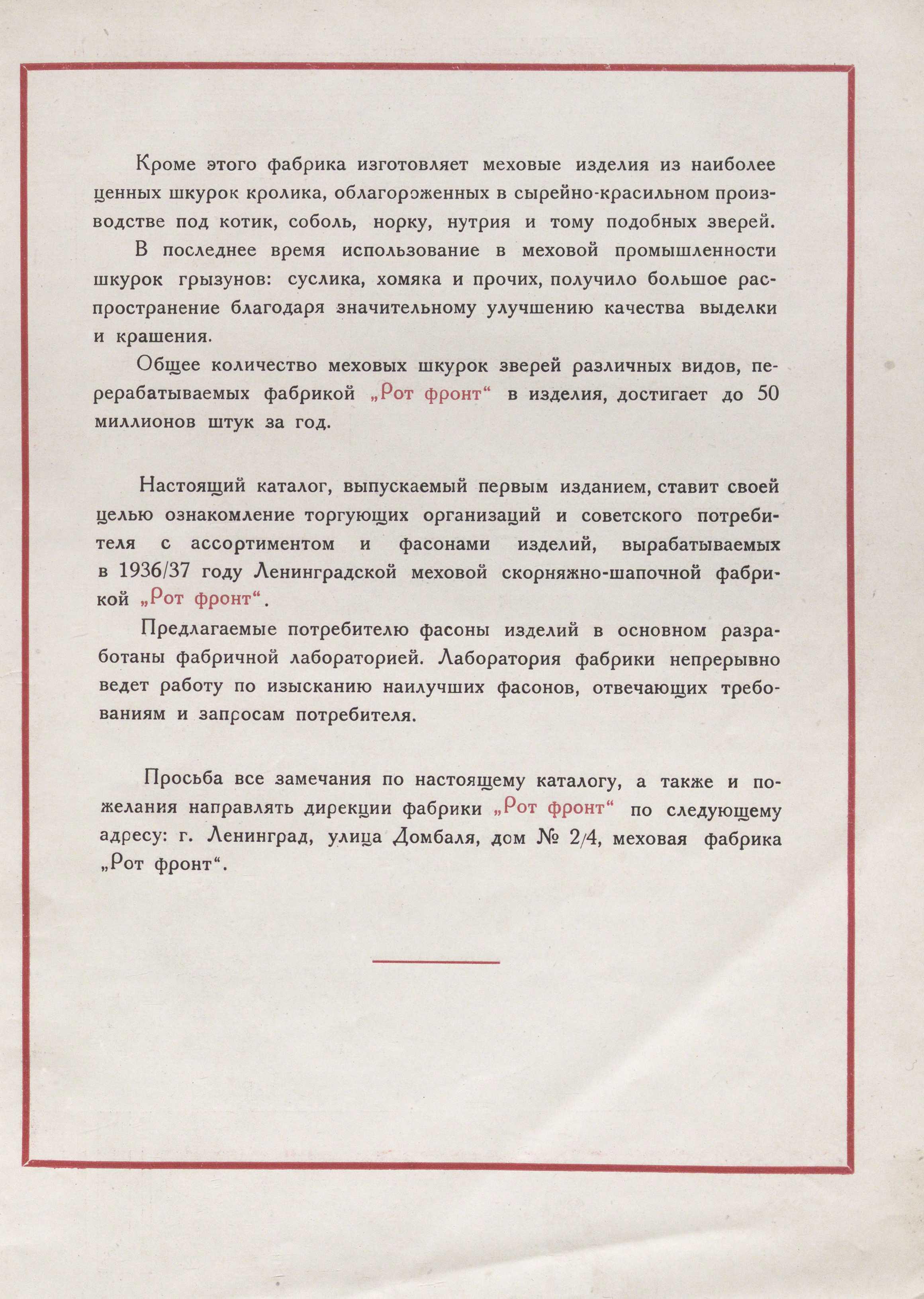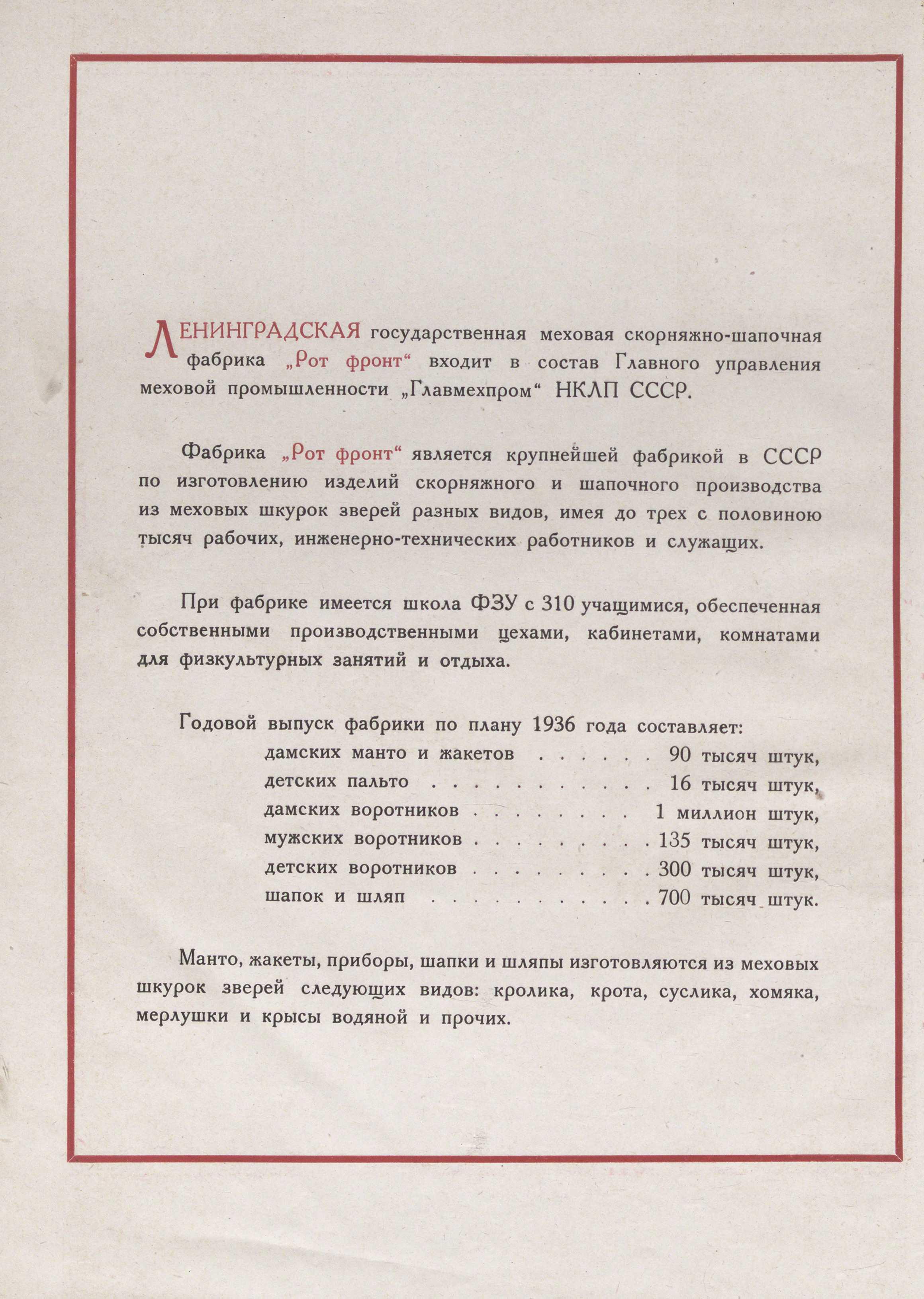 Автор: Качинский Антон ВикторовичЛенинградская меховая фабрика "Рот-Фронт". Большевики любили звучные названия давать предприятиям украденным у владельцев. Свои заводы они просто онумеряли, а вот тому что поперли давали названия, тика "Рот-Фронт", "Кировский2 и тд
