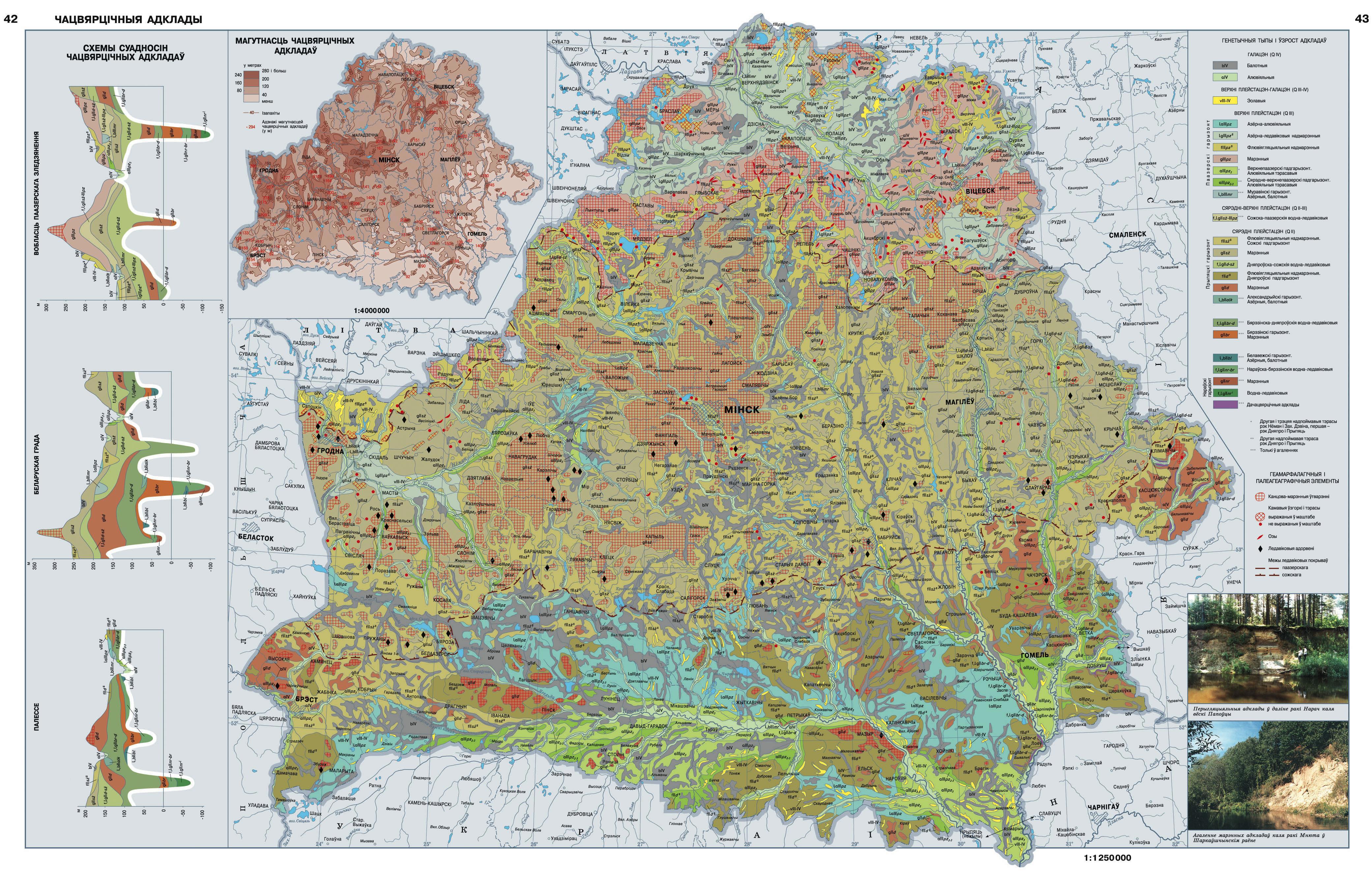 Карта означает, что вся Беларуси покрыта ледниковыми отложениями и более молодыми. То есть глинистые грунты, пески и торф. Практически нигде нет не то, что выхода скал на поверхность в отличие от, например, Пскова, а даже такого, что можно докопаться до них или пробурить скважину буровой ПБУ-2, которая делает скважины до 30 метров. На маленькой карте слева сверху показана мощность четвертичных отложений.