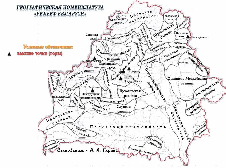 Как видно по ней, есть два типа рельфа, это равнины и холмистая местность. И довольно значительная часть территории республики это холмистая местность, все возвышенности кроме Мозырьской гряды. Хотя большая это равнины.