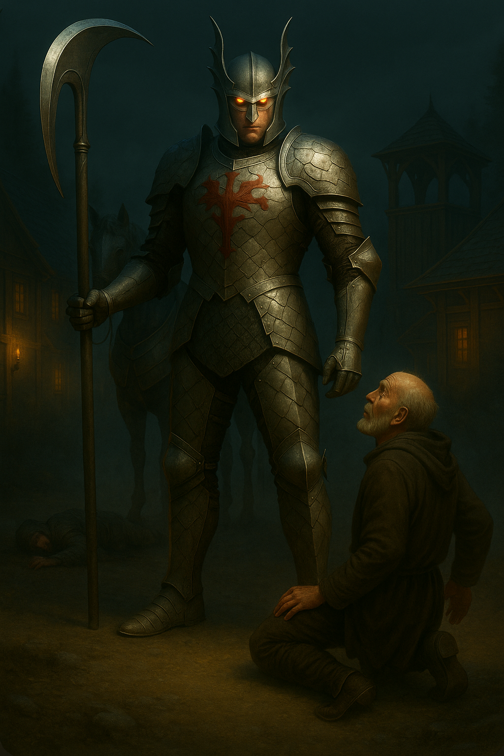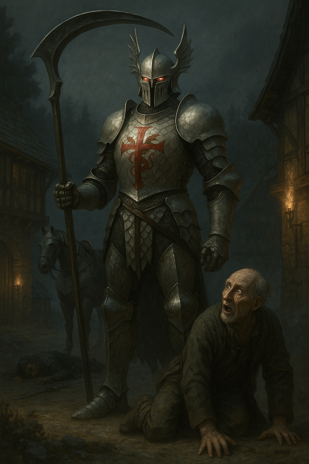 Он уже поднял меч над головой старика, как вдруг затряслась земля, и искажённое от ужаса и изумления лицо разбойника разлетелось на куски. Возле колодца остановился гигантский всадник, на столь же гигантском коне, облачённом в латы. Всадник спешился. Его огромная чешуйчатая броня блистала в лучах закатного вечера. На нагруднике красовался эскиз в виде красного креста с огнедышащим драконом сзади. В руке он держал массивную косу, покрытую плотными металлическими чешуйками. А на голове его сидел такой же чешуйчатый белый шлем, напоминавший дракона с длинными крыльями по бокам. Несмотря на всю закрытость доспеха, шлем не закрывал его рта и острого щетинистого подбородка. Ростом рыцарь был выше своего коня и даже колодца, самый высокий разбойник еле доставал макушкой до его груди.