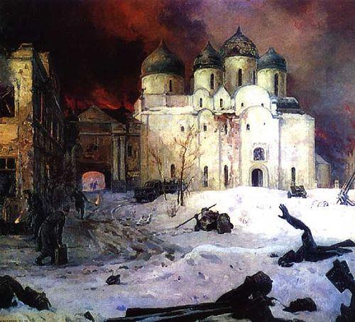 Кукрыниксы, картина «Бегство фашистов из Новгорода», 1944—1946. На переднем плане фрагменты разбитой скульптуры, похожие на убитых людей