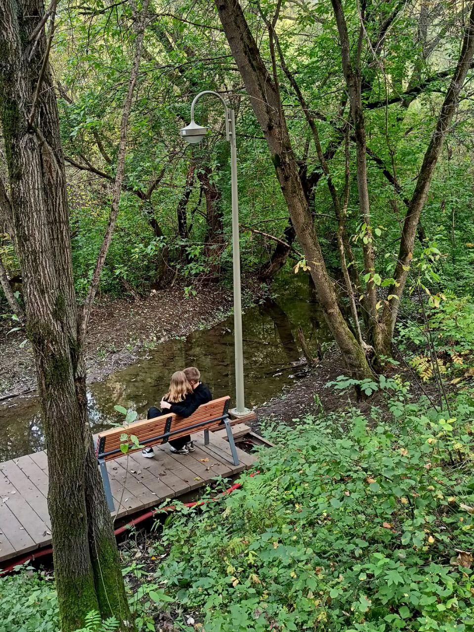В Перми у лесной речки для сладких объятий скамеечка. Тишина. благодать, только чуть слышно шуршат жёлтые и красные листья, кружась среди веток.