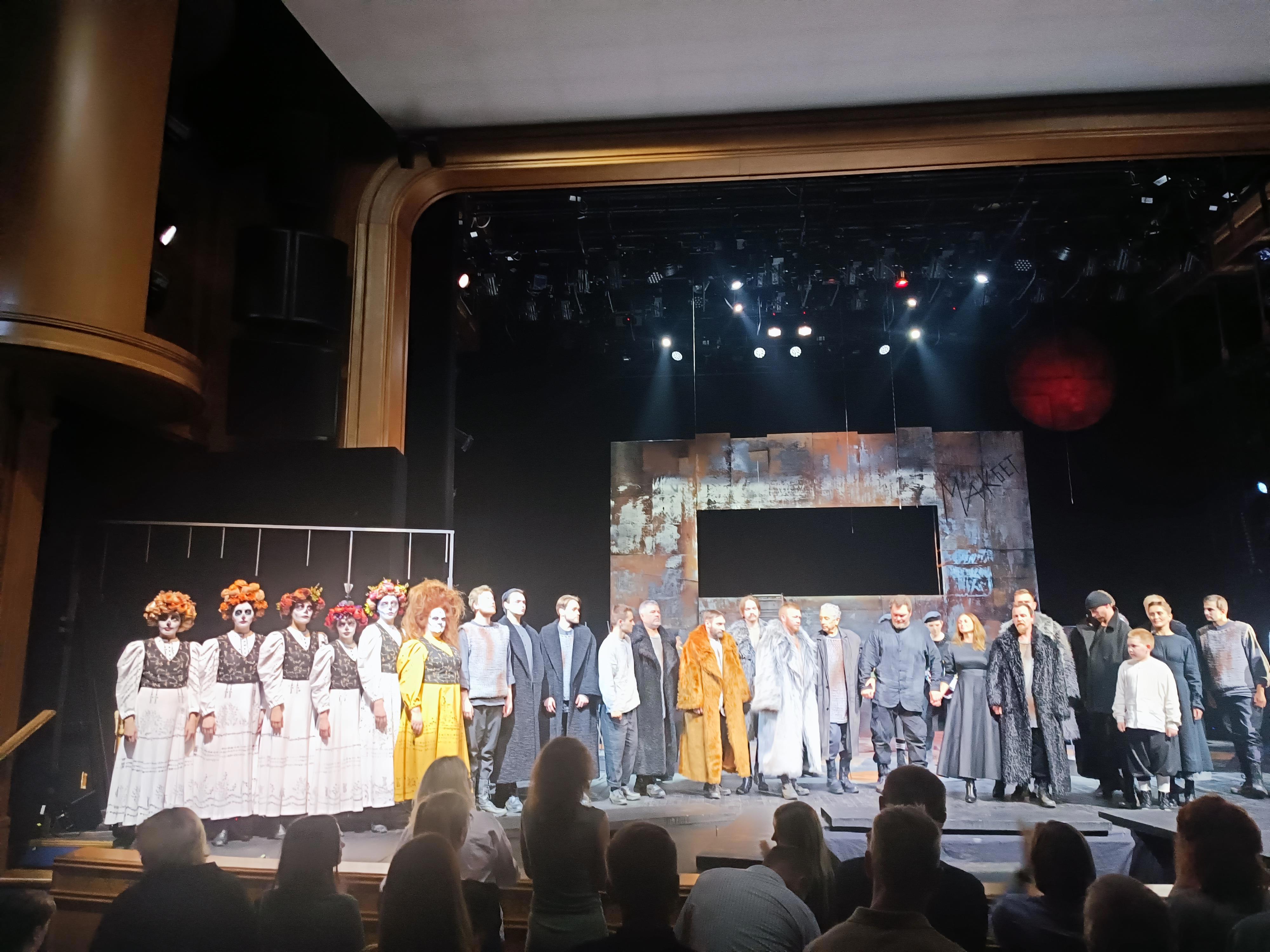 Понравились мрачные лаконичные декорации. Очень понравилось музыкальное сопровождение. Музыканты сидели на сцене и были постоянно вовлечены в процесс, от них были реплики. За всё время артисты ни разу не сбились. А ведь текст в стихах! Отыграли все безупречно.