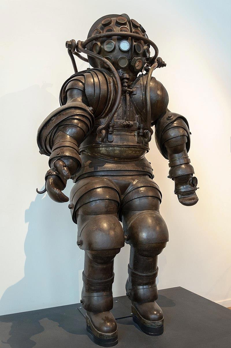 Костюм, созданный братьями Карманьолле в 1882 году. За основу для создания снаряжения братья взяли средневековые доспехи, которые, по их мнению, могли уберечь от высокого давления толщи воды: