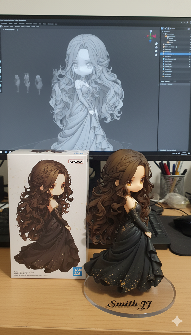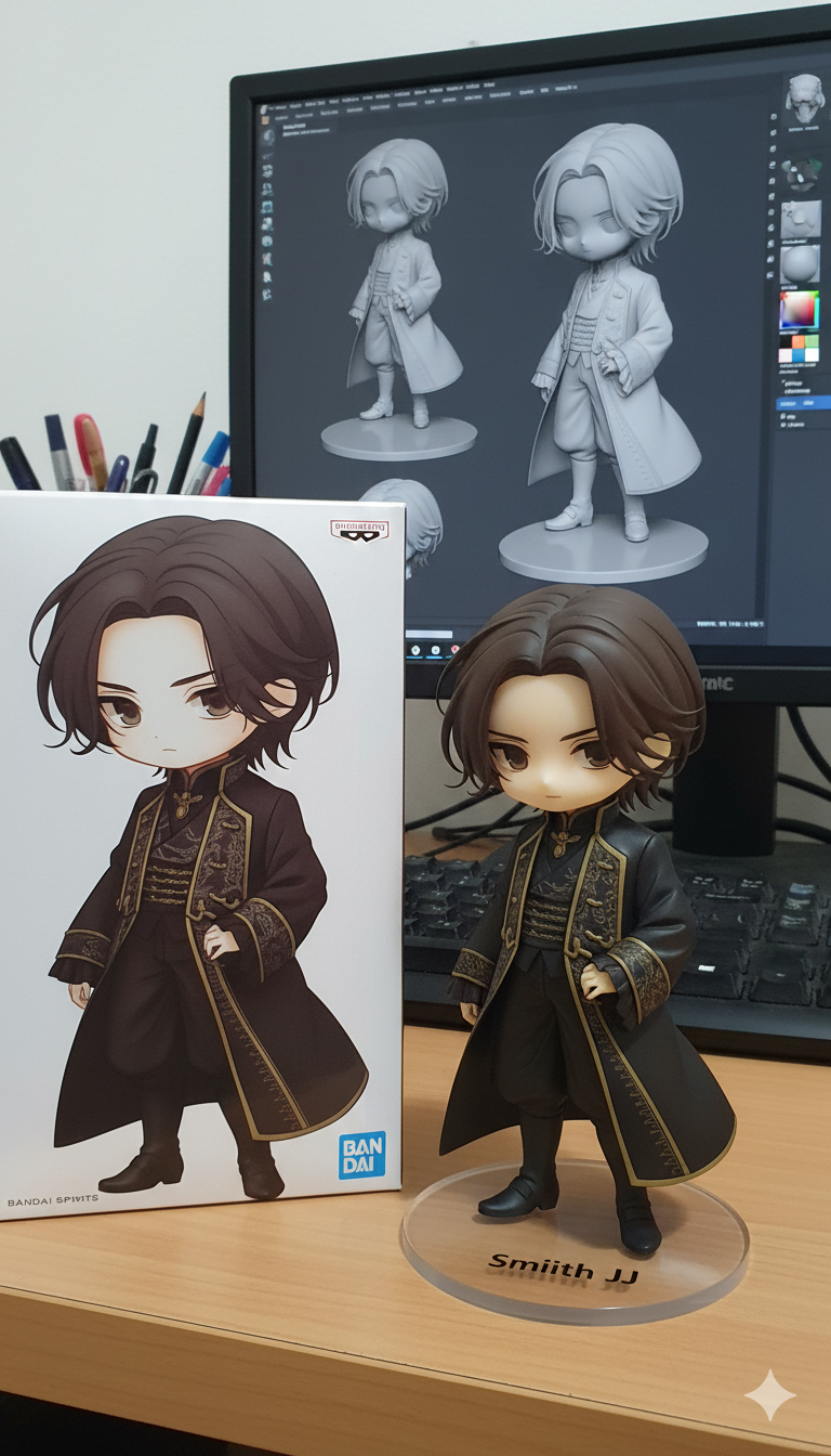 Create a 1/7 scale commercialized figurine of the characters in the picture, in a realistic style, in a real environment. The figurine is placed on a computer desk. The figurine has a round transparent acrylic base, with Smiith JJ (Text color is Black) . The content on the computer screen is the Zbrush modeling process of this figurine. Next to the computer screen is a BANDAI-style toy packaging box printed with the original artwork. The packaging features two-dimensional flat illustrations.