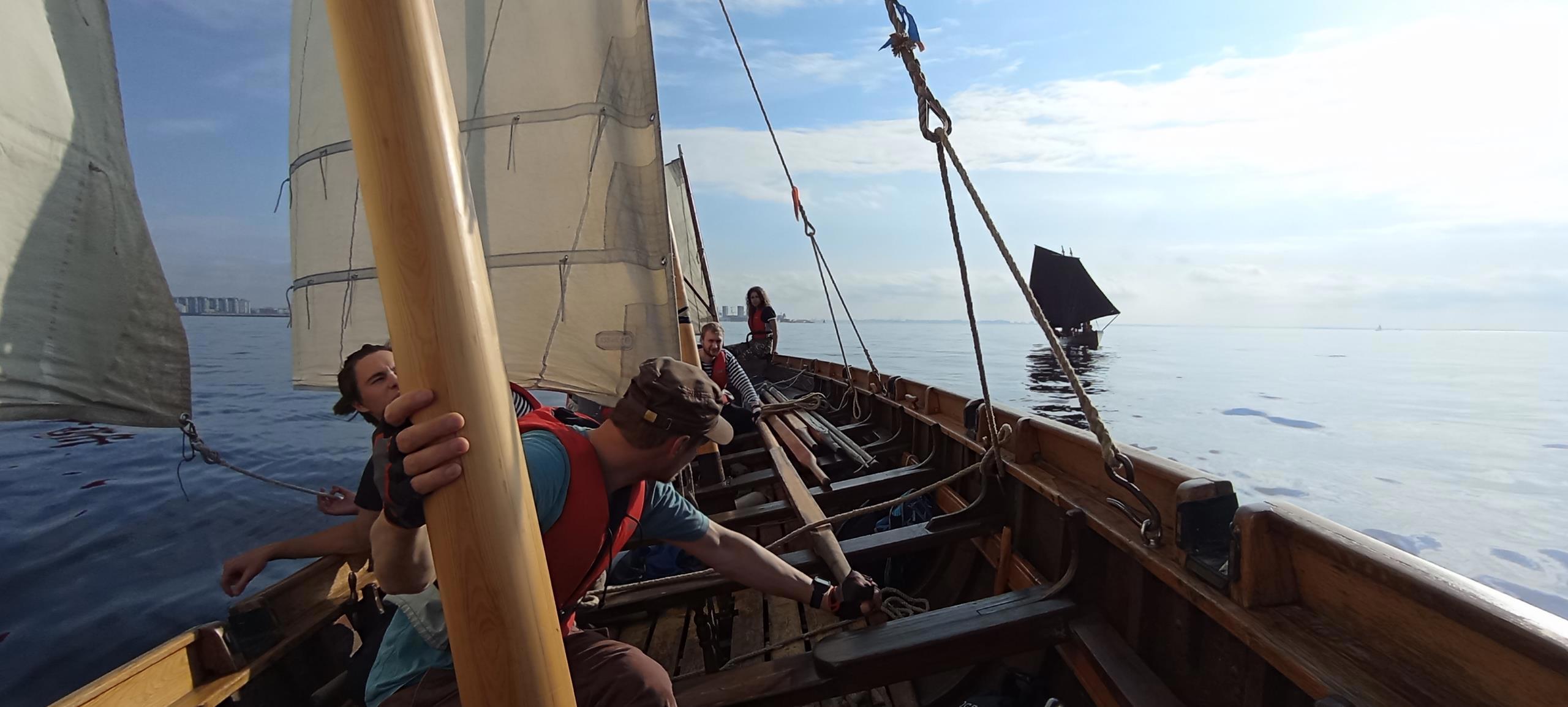 Вот, это кадр уже внутри гички. Перед нами – фок мачта, за ней парус грот-мачты, а там, далеко – бизани чуток. Вёсла убраны, на них ходят, когда паруса сняты