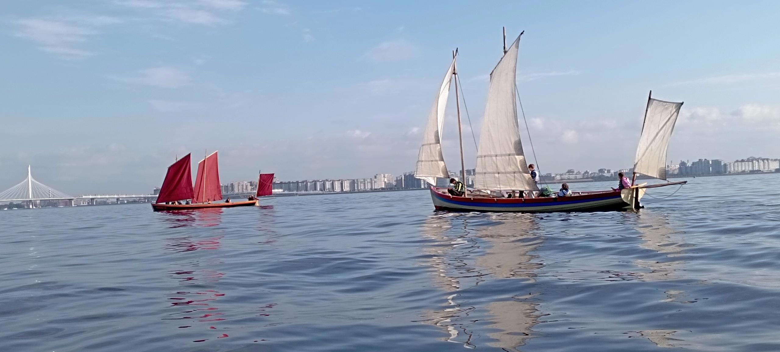 Мы плыли вот на такой гичке, но это, конечно, не наша. Снимали с борта. Слева виден ЗСД (Западный скоростной диаметр, по которому можно ехать с севера до юга города над заливом). Гичка это шлюп под парусами, XVIII век. В данном случае это, конечно, реплика, но с реальных судов, даже названия сохранены.