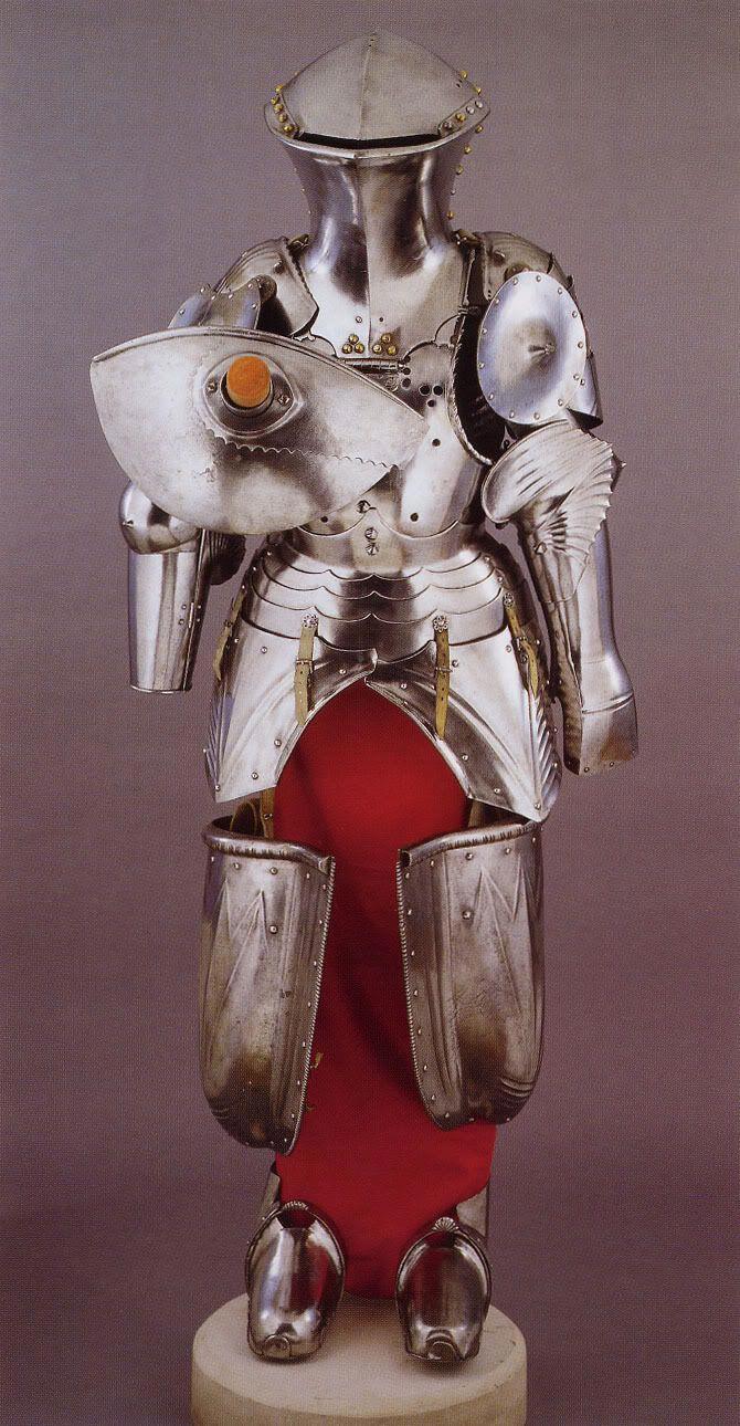 Турнирные доспехи: как уже писал выше — тяжёлые. А ещё ассиметричные, с усиленной защитой по левой стороне, чаще принимающей удар по объективным причинам.