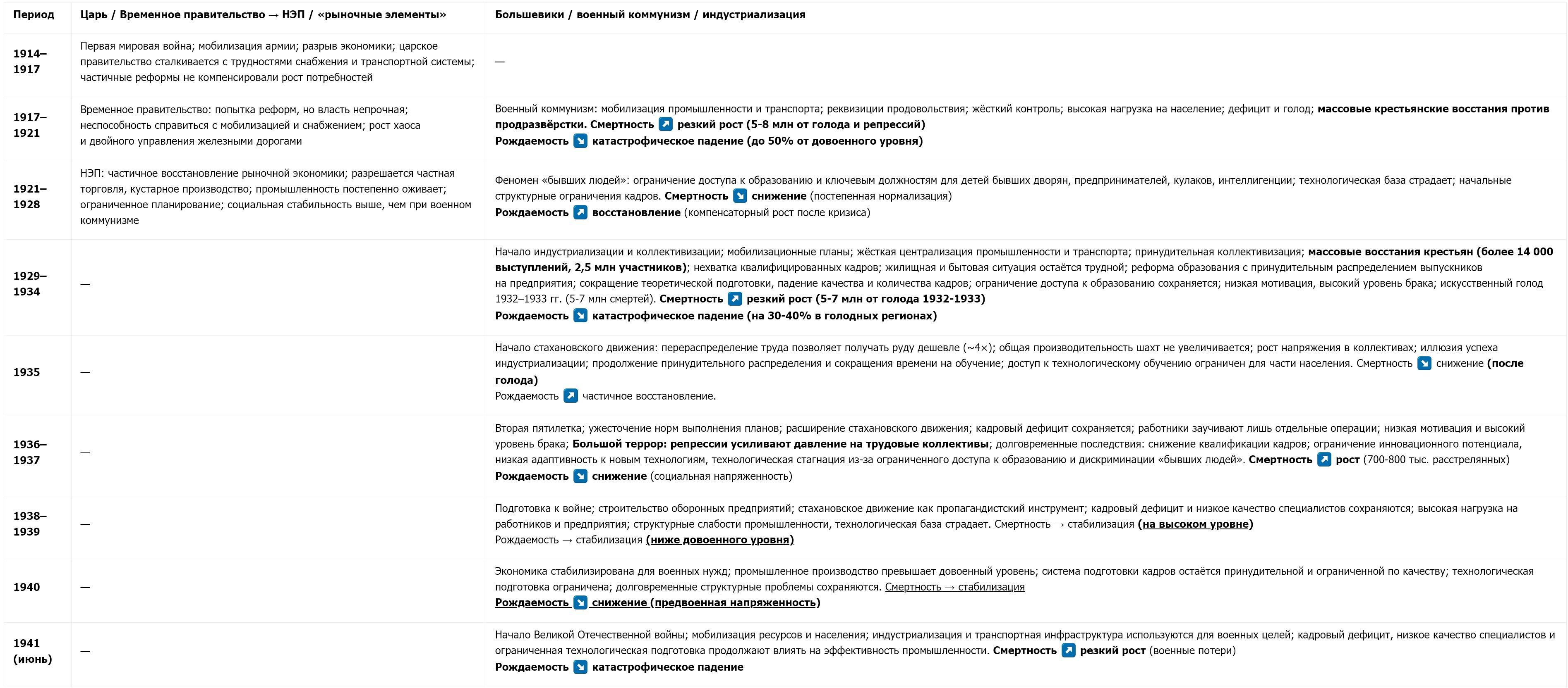 Сводная таблица управленческих решений в период 1914-1941