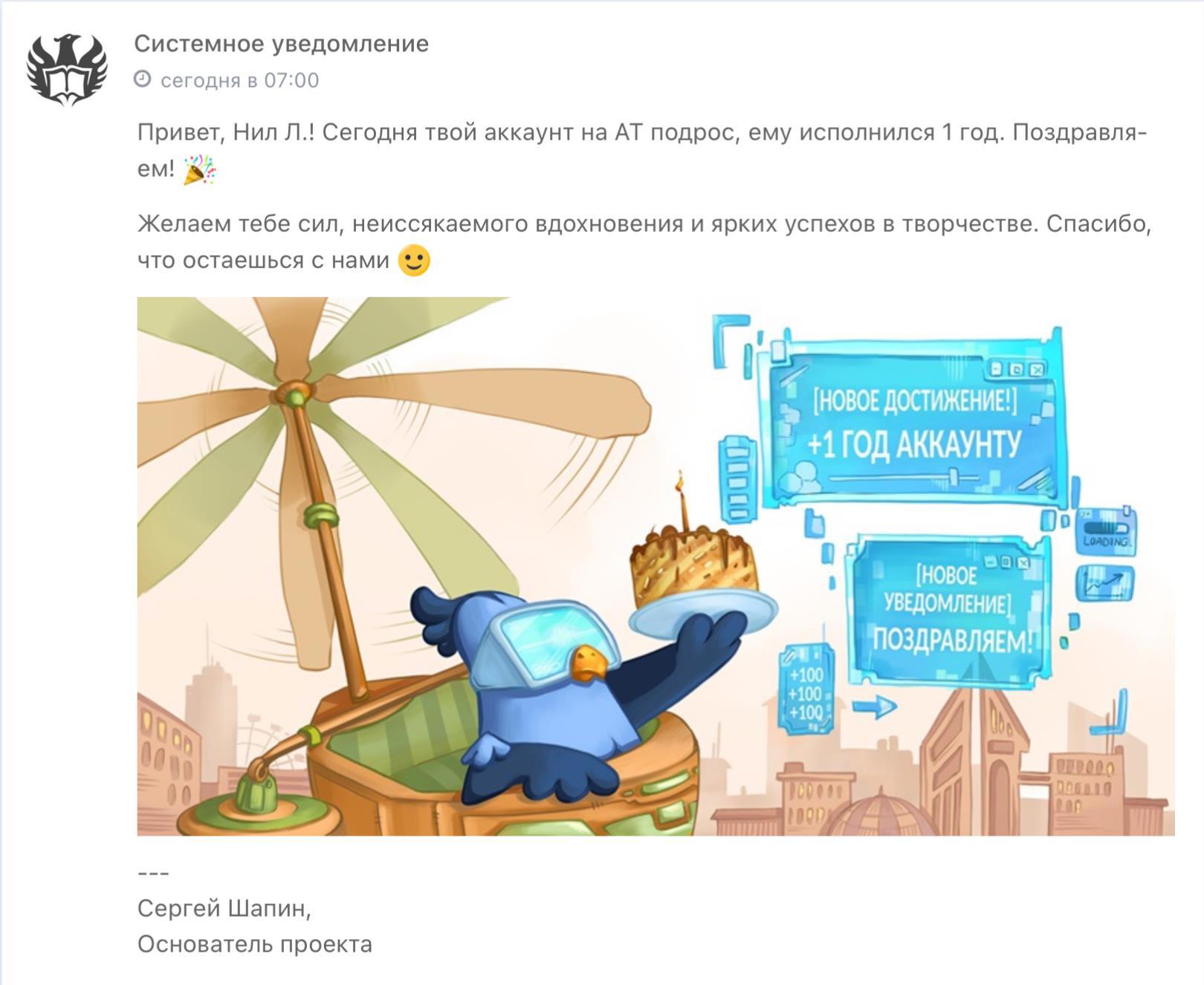Автор: Нил Л.А ведь у меня сегодня, оказывается, днюха, о которой я благополучно забыл. Открываю уведомления — а там меня уже открытка дожидается. Вот только День создания аккаунта я за день рождения автора не считаю. Для меня настоящий ДР будет психологически позже, в январе — в месяце, когда началась выкладка первой книги.