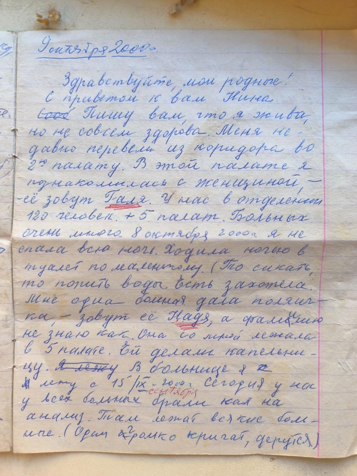 В завершение статьи хочу рассказать печальную личную историю: Папина сестра Нина в детстве перенесла менингит. До болезни она была отличницей, гордостью школы. А после не узнавала родных, забыла бытовые навыки и часам сидела без движения в своей комнате. Но что-то внутри её поврежденного мозга, очевидно сохранилось — вот какие письма она писала нам из сумасшедшего дома, где лежала для лечения сопутствующих болезней — в обычную больницу её не принимали.