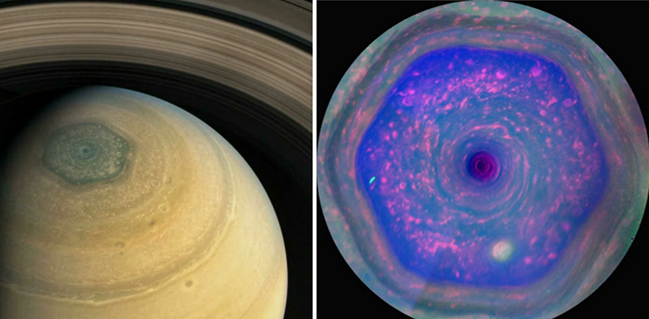 Шестиугольник на Северном полюсе — один из самых загадочных феноменов Сатурна. Устойчивый вихрь, существующий десятилетиями и остающийся стабильным, несмотря на постоянные изменения окружающей атмосферы. У него четкая форма правильного шестиугольника, каждая сторона которого имеет примерно 13,8 тыс.км (чуть больше диаметра Земли).